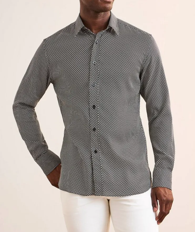 - Bursting with a polka dot print, this flowy shirt can easily be dressed up or down for a variety of occasions. Style with structured wool dress pants and leather oxfords for boardroom meetings. Swap out the dress pants for streamlined jeans for dinner and drinks afterwards.