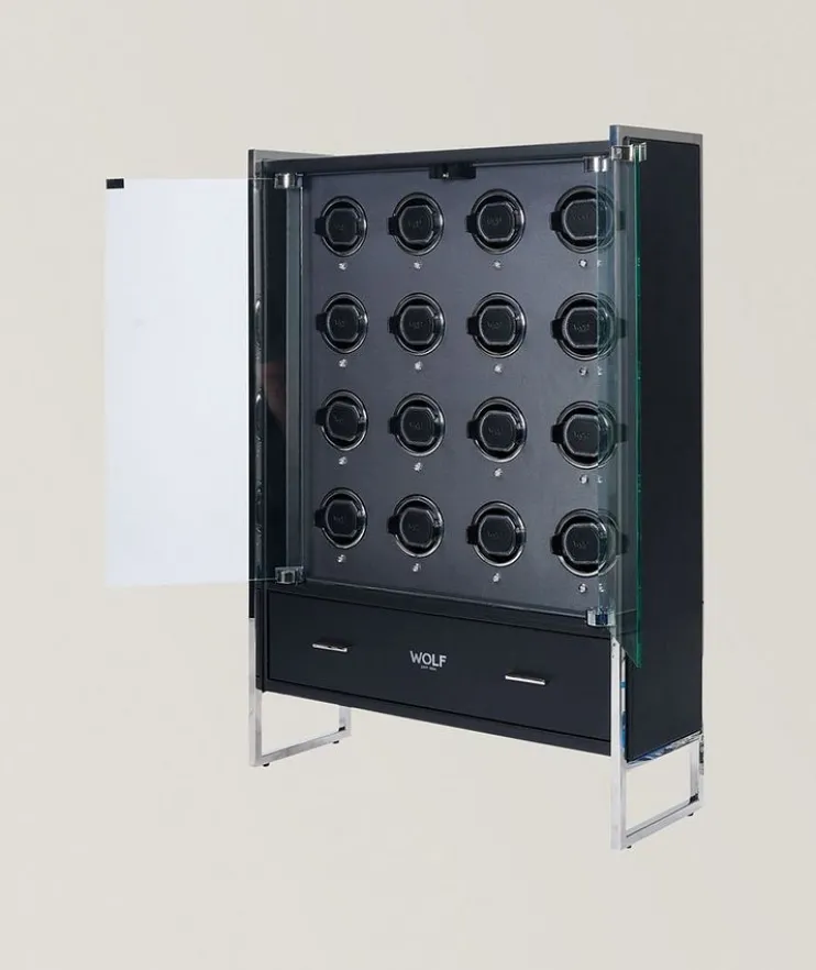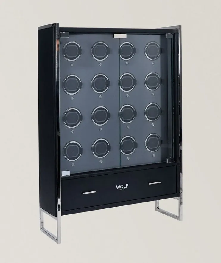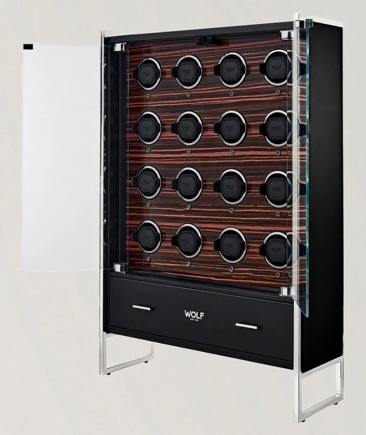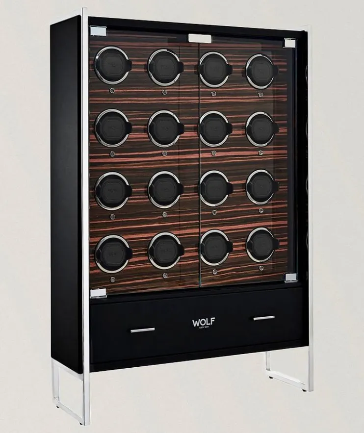 - Since 1834, founder Philip Wolf has based his brand, WOLF 1834, around the belief that one’s sentimental belongings should be properly stored in finely crafted cases when not in use. From watch winders and stands to rolls and boxes, Wolf’s legacy is still passed on to ensure your watches are properly looked after and remain in sublime condition. The brand’s watch winders are sustainably handmade precision instruments that focus on the health of your watch with its patented innovation, counting each rotation instead of roughly estimating the number. Crafted to proudly display each watch, WOLF’s watch winder cabinet features sixteen watch slots and room for storage to ensure all of your pieces are taken care of.