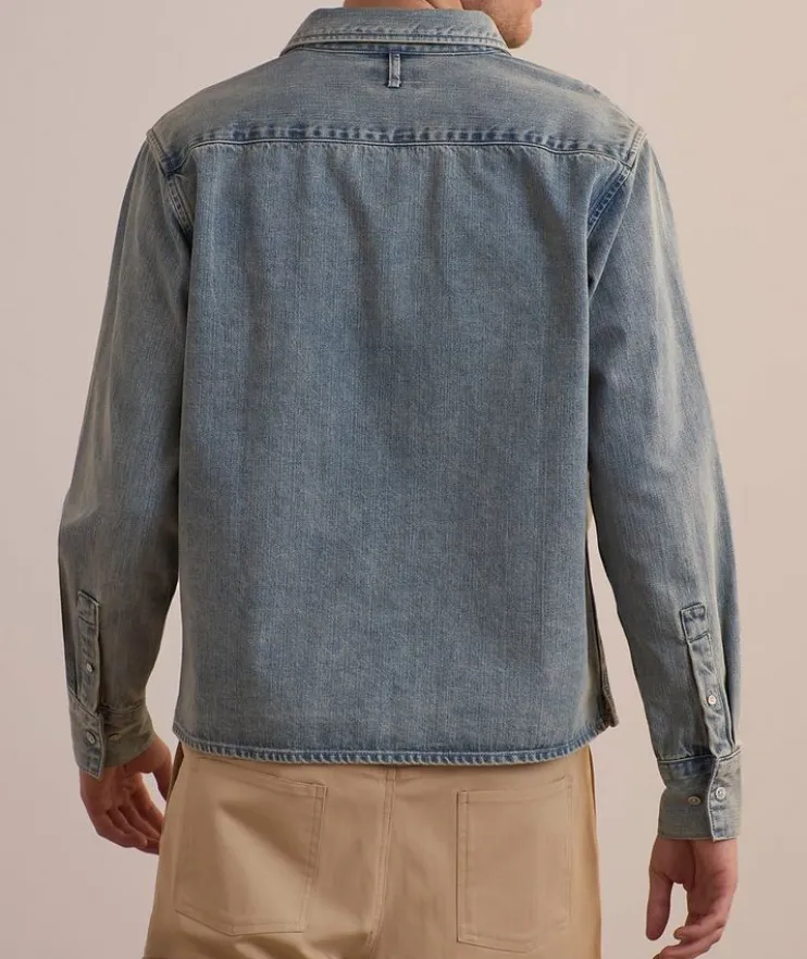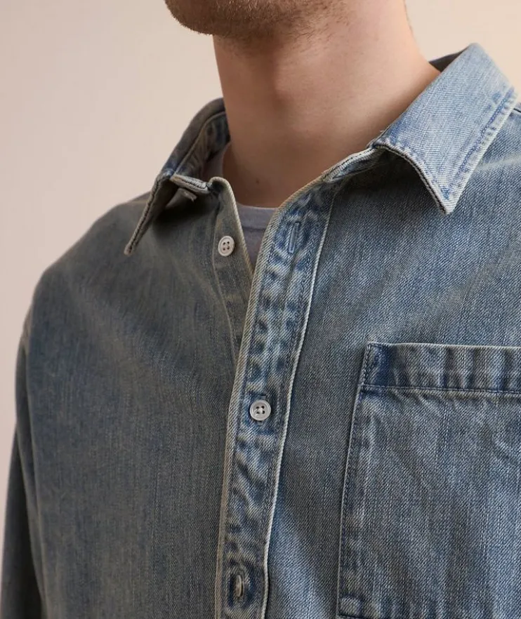 - Boasting a classic button-down front with a sharp collar for timeless appeal, this denim shirt is tailored in durable, breathable cotton for all-day comfort while maintaining a polished look.