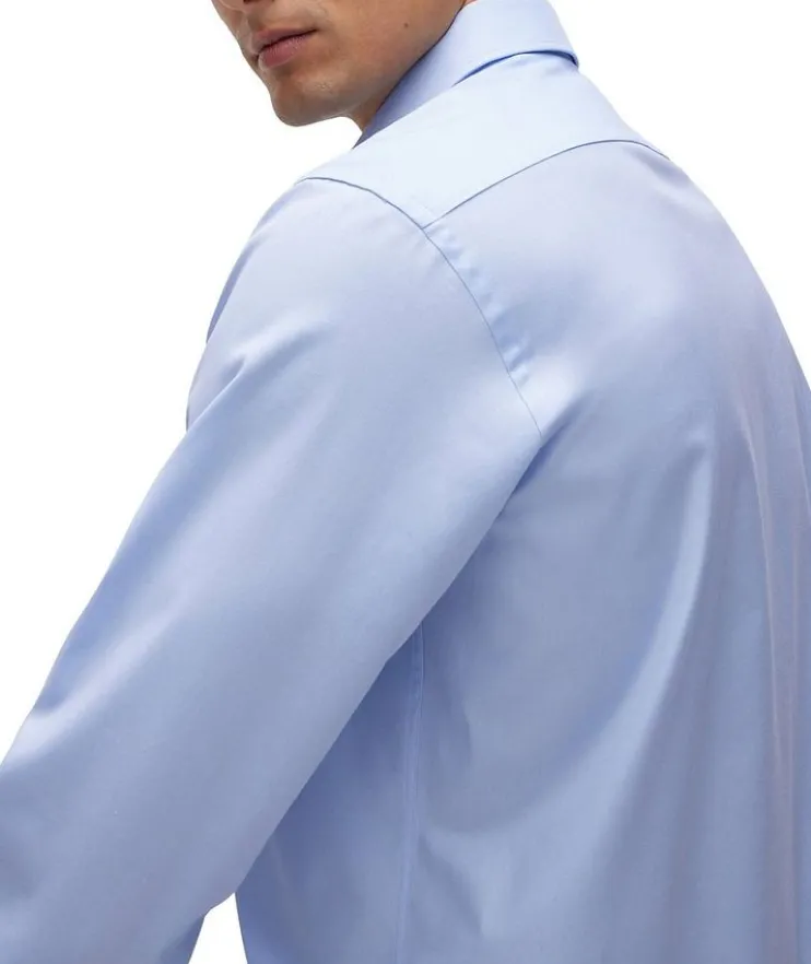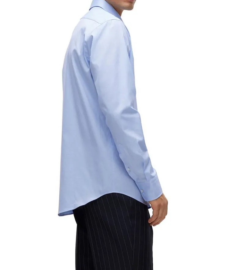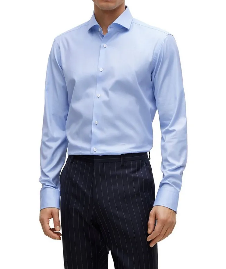 - BOSS takes a refined approach to shirting with this classic dress shirt. Crafted in pure-cotton twill for everyday comfort, this versatile shirt is designed with an engineered stripe at the underplacket, and a single contrast button to complete the elegant piece. Wear the sleek shirt for contemporary workwear or night out looks alike.