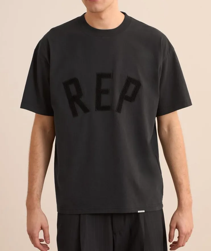 - A slightly oversized casual cool t-shirt made from medium weight jersey cotton, this drop-shoulder design features a textured ‘REP’ applique on the front with overlock seams on the shoulders. The brand’s metal bar logo on the hem completes the signature look.