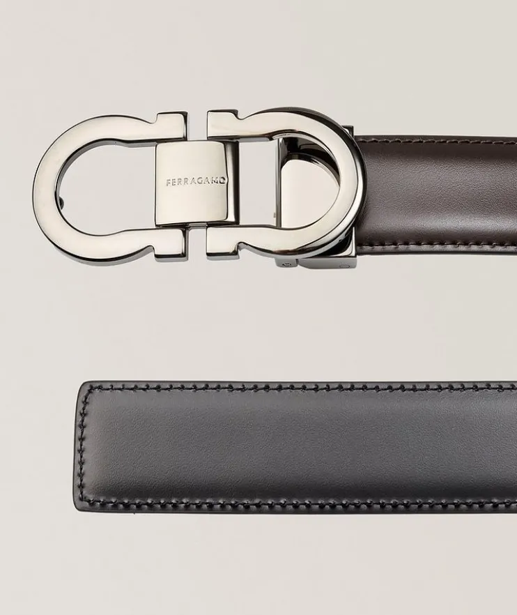 - Smooth calfskin belt featuring a reversible, two-tone construction for flawless versatility. The buckle with double-Gancini silhouette features a square tag with engraved logo.