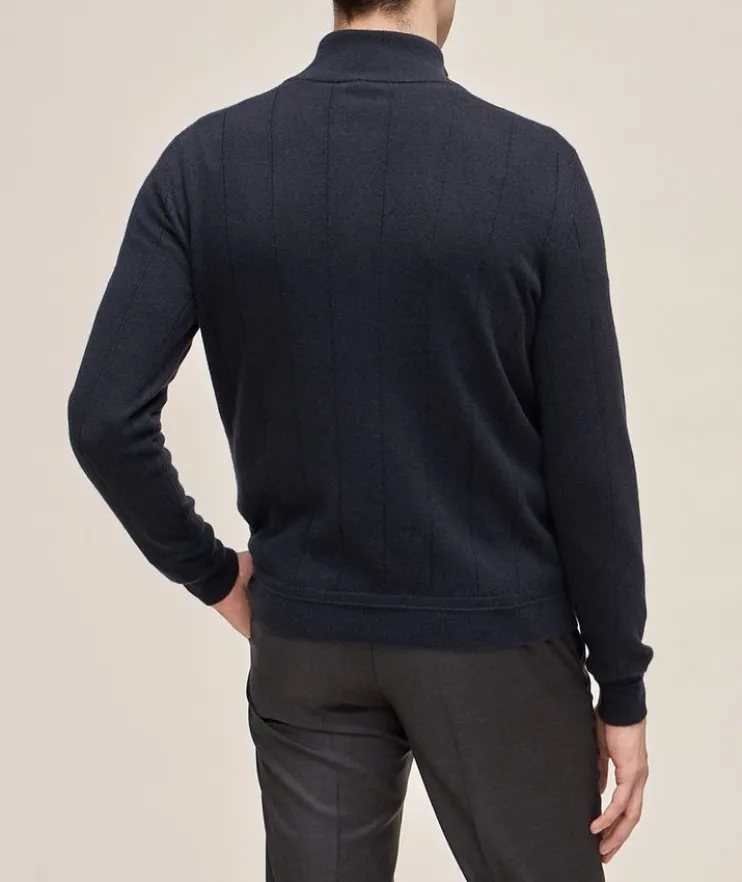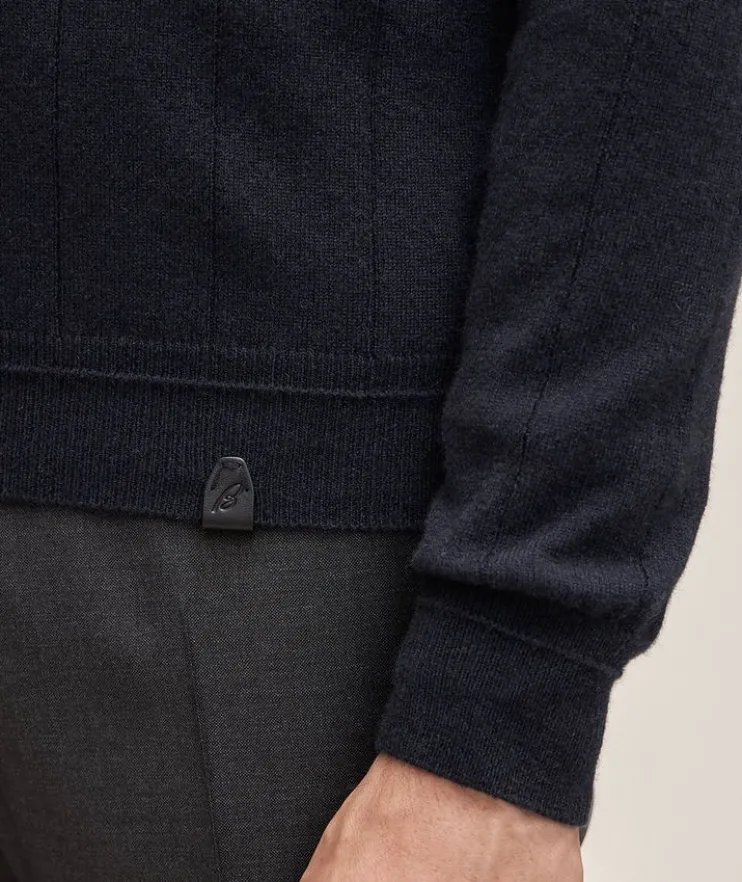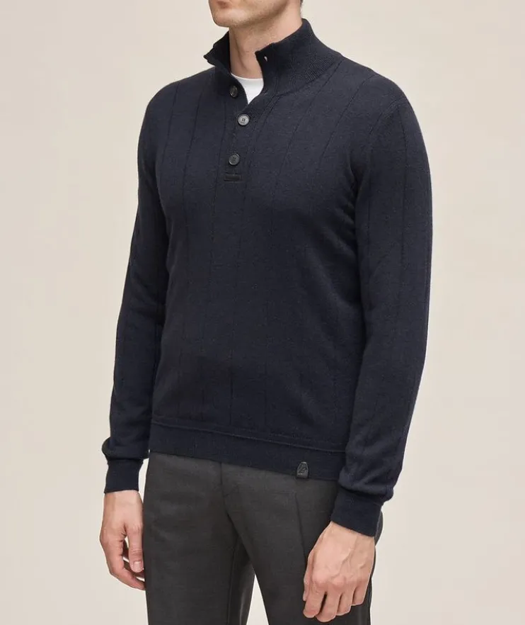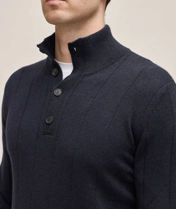 - This mid-weight turtleneck sweater is crafted frp, 100% cashmere with subtle ribbed trims all over. The leather details add a luxury feel, complemented by horn buttons down the front and a high neckline for extra warmth.