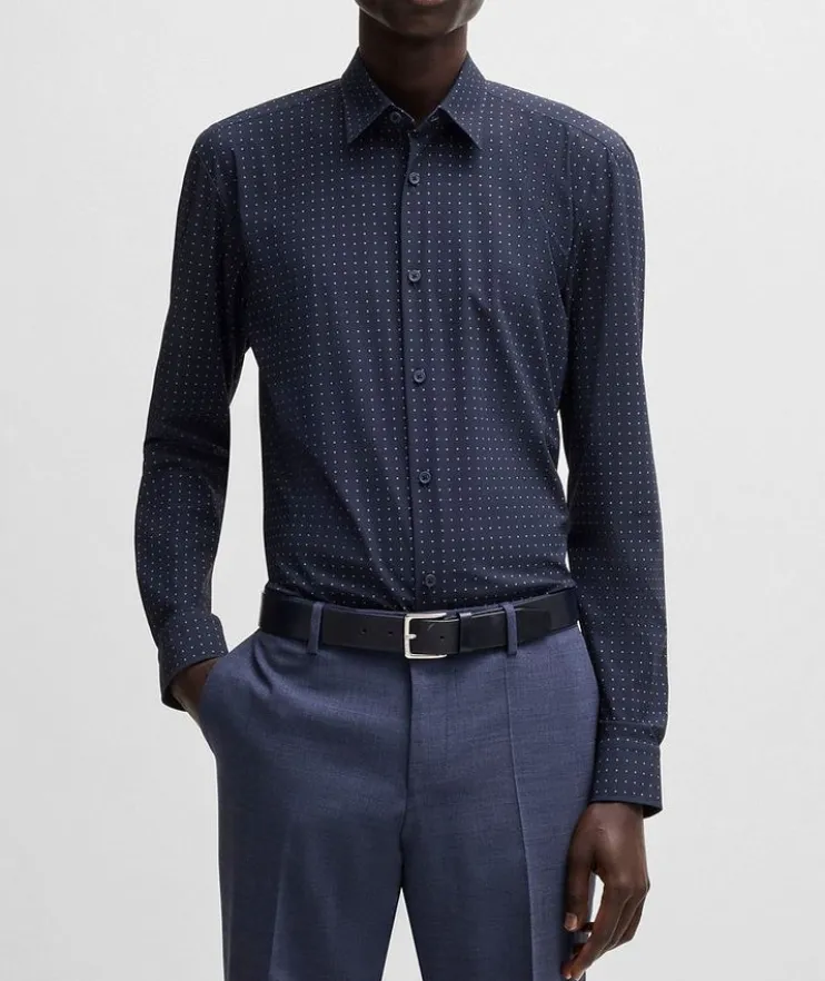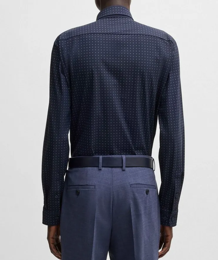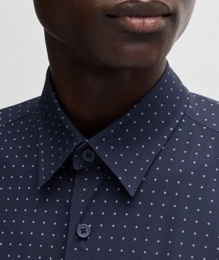 - Constructed in a slim fit with generous stretch, this contemporary jersey shirt with geometric print is perfect for the office as well as elevating casual styles.
