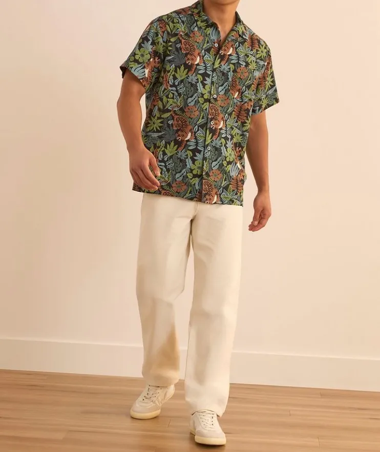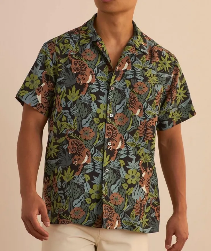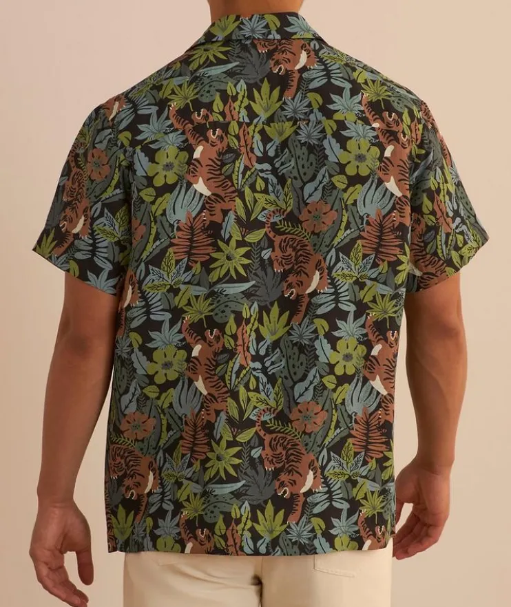 - The freshness and comfort of viscose and linen blend give life to this jungle-theme shirt with allover floral, leaves and tiger print.
