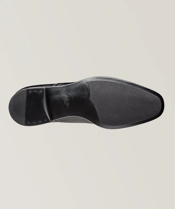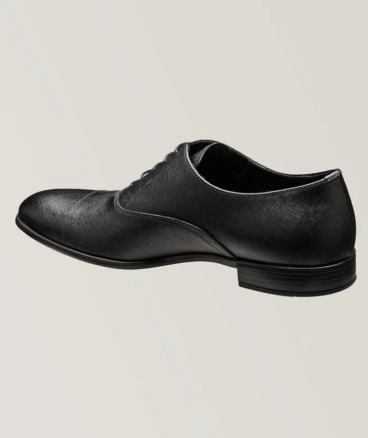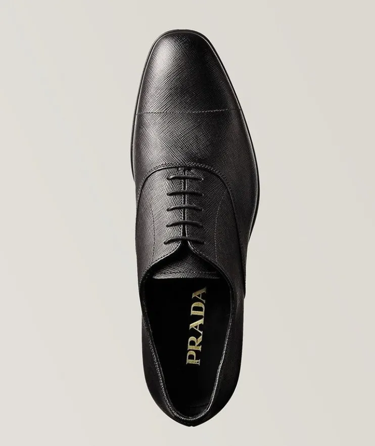 - These lustrous Prada dress shoes combine the elegance of premium Saffiano leather with the practicality of a hard-wearing rubber sole. The scratch-resistant design is an ideal choice for polished gentlemen building an office wardrobe.