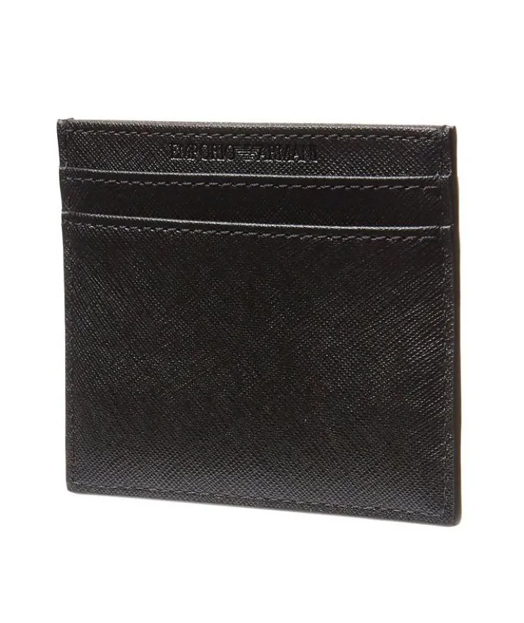 - This cardholder by Emporio Armani is part of the brand’s Sustainability Project; it’s composed of leftover leather, which has been processed and assembled without using adhesives and while staying conscious of water conservation. A saffiano-textured print and contrast logo completes the design.