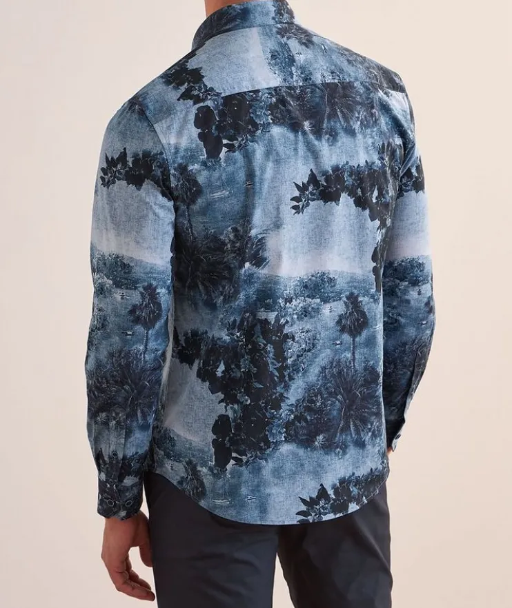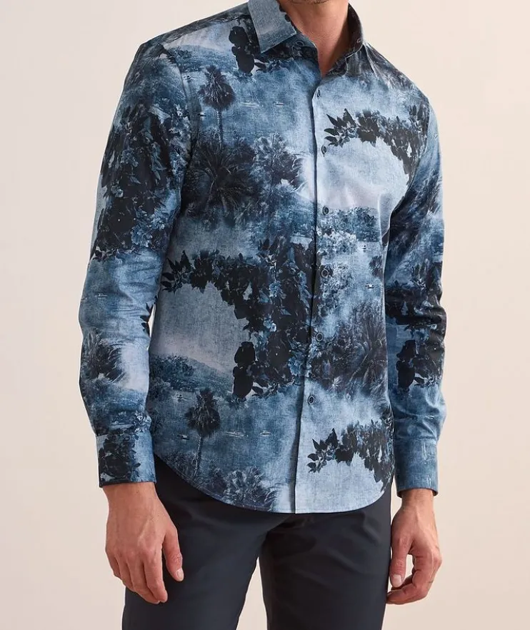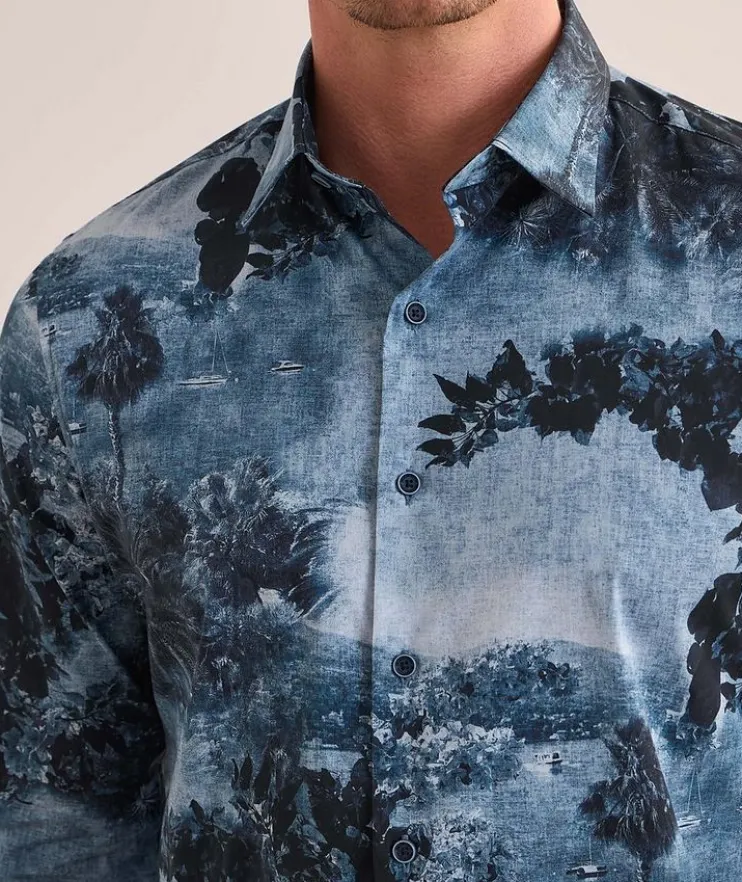 - Crafted from the brand’s Comfort Stretch cotton, this casual sport shirt is soft to the touch and boasts a scenic tropical print.