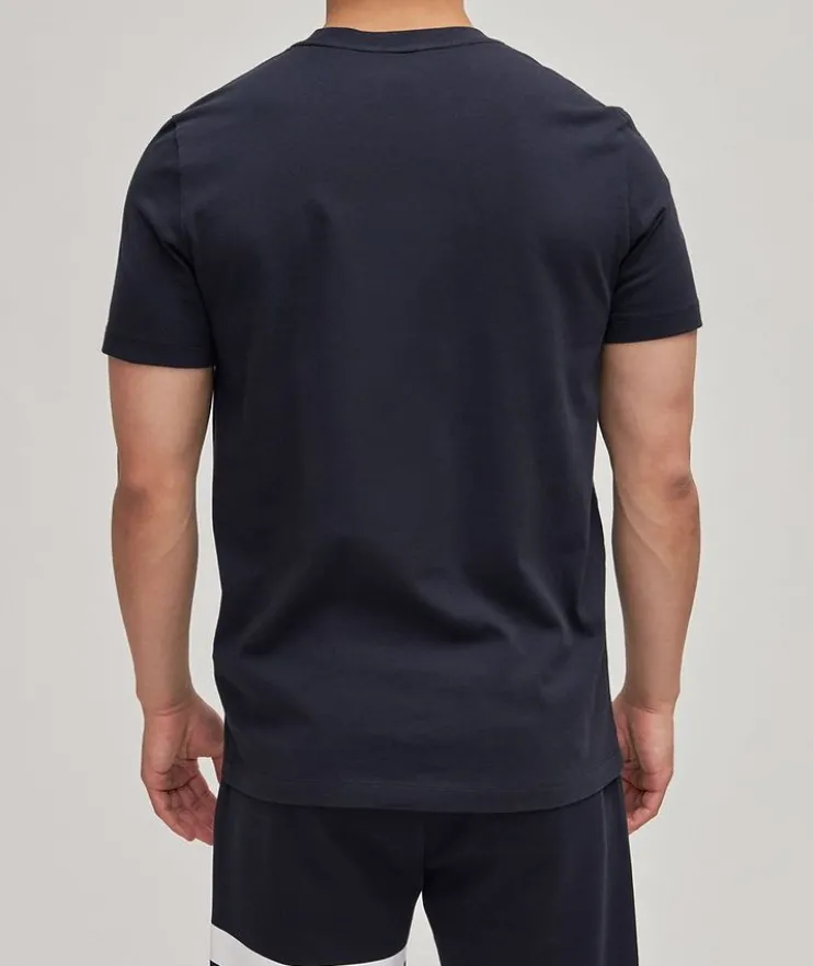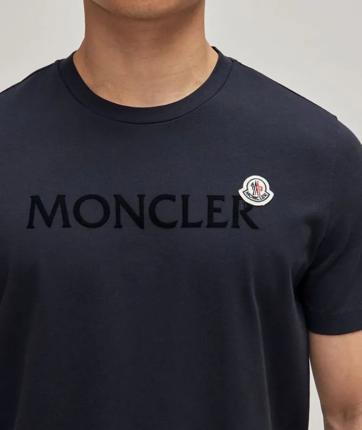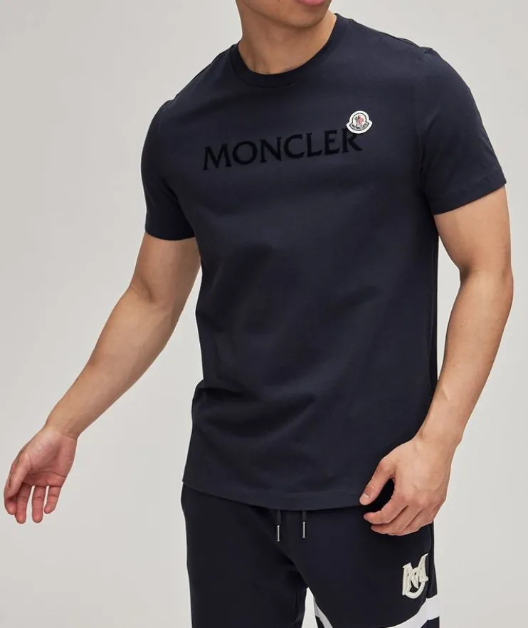 - Moncler’s authentic character comes out in a modern manner with this eye-catching t-shirt. Crafted from ultra-soft Jersey cotton, the crew neck silhouette is flocked with an embroidered logo on the front and paired with felt scripting for the ultimate brand awareness. Pair with your favourite runners and sweats for an athleisure vibe.