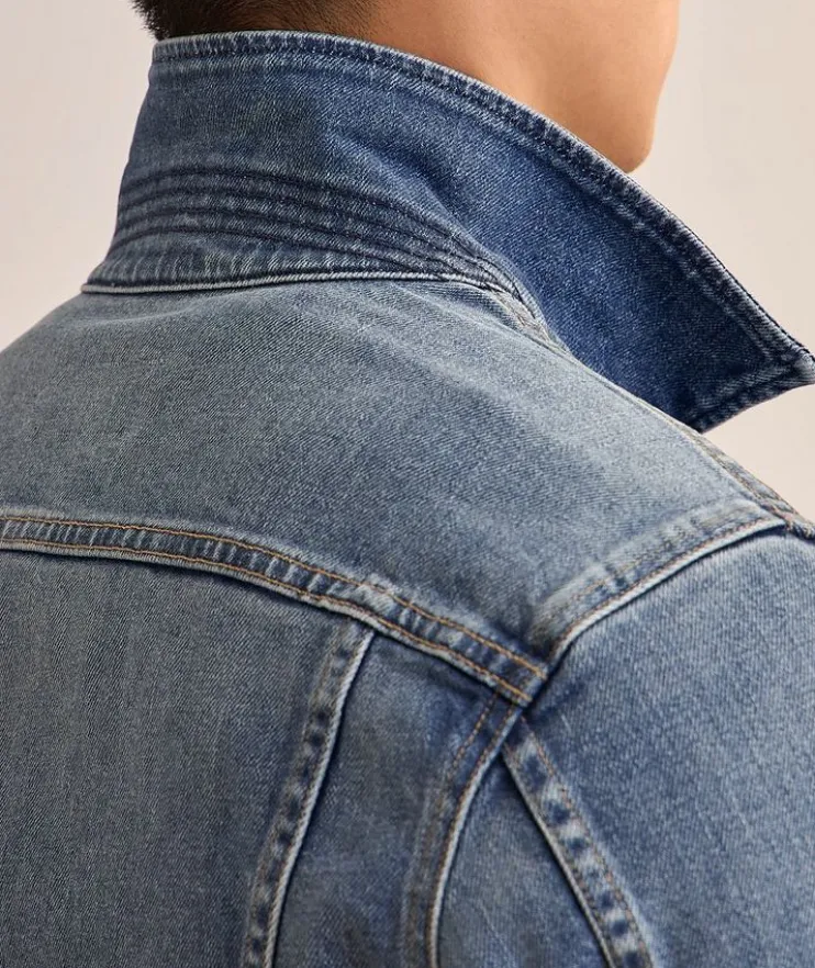 - Constructed in a refined fit with classic details, this timeless denim jacket adds casual elegance to any ensemble. Pleat and seam details add a streamlined look to create a flattering silhouette.