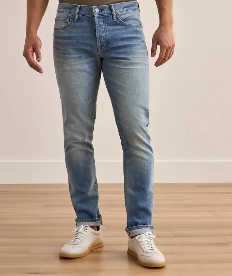 - Showcasing a faded finish with whiskered details for a vintage-inspired aesthetic, these slim fit jeans are a timeless addition to any wardrobe.