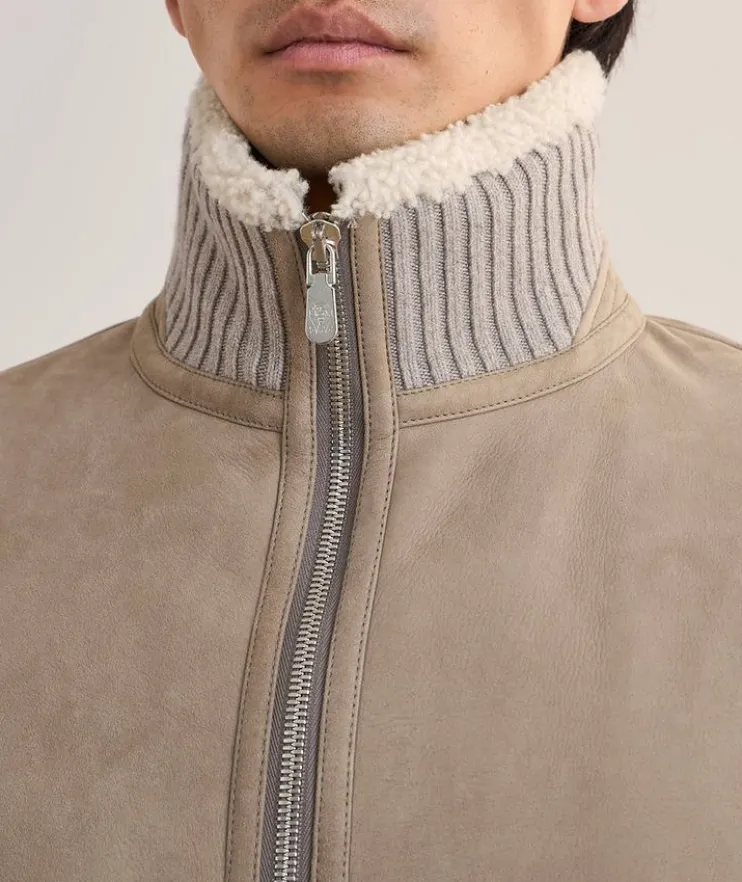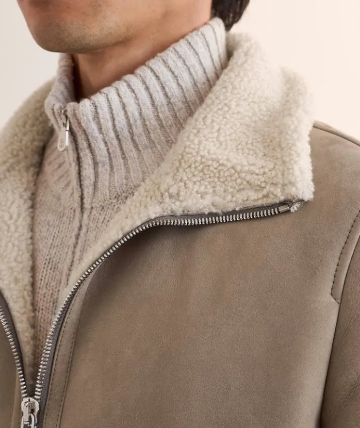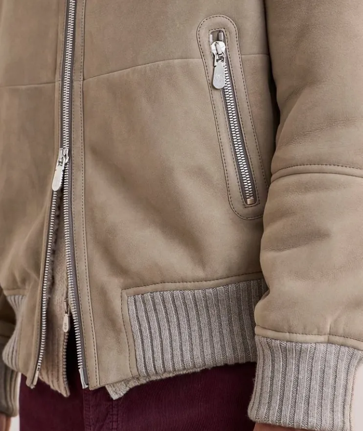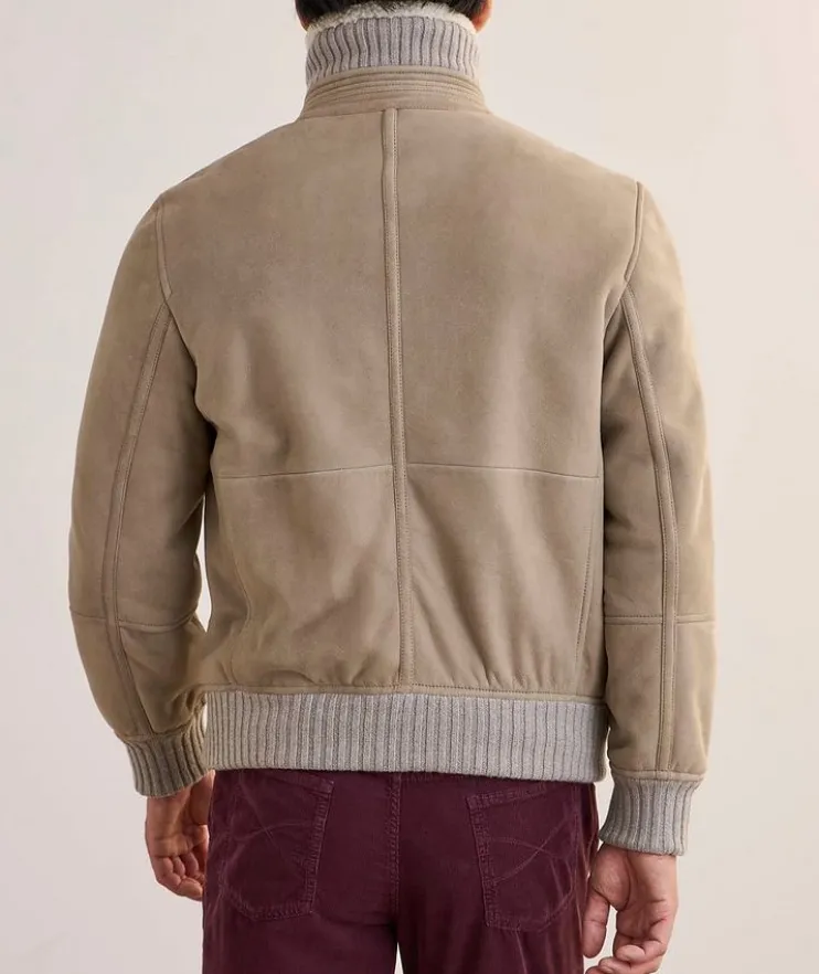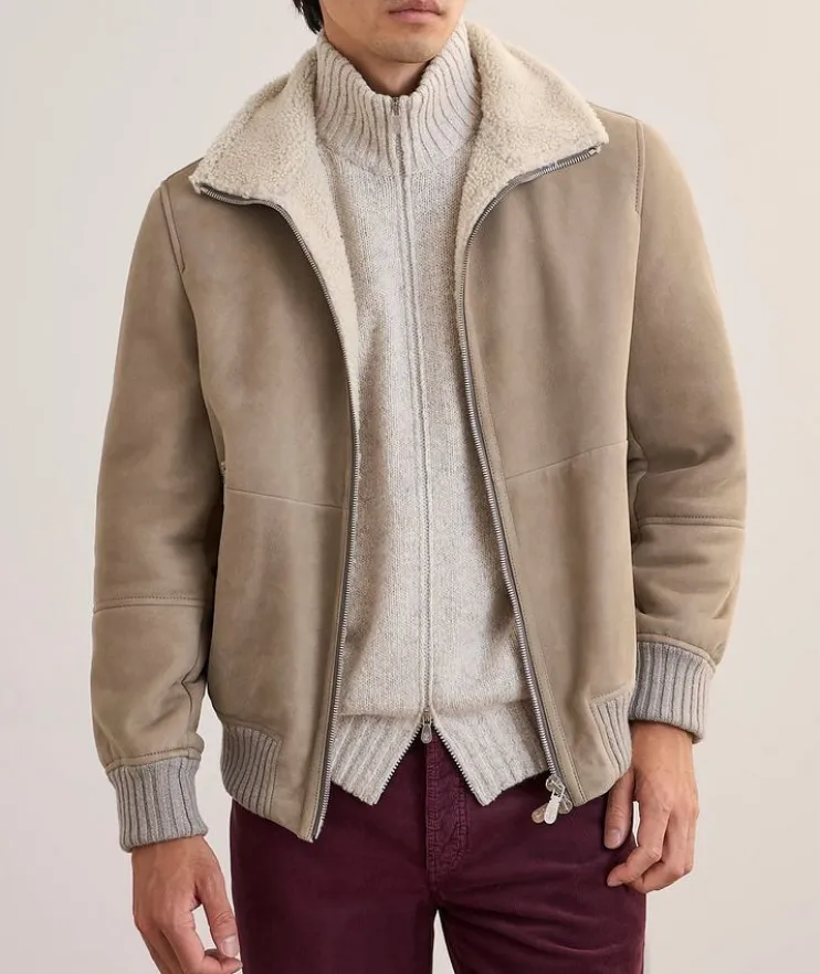 - Expertly crafted in Italy from supple suede with a two-way zip closure and front zip pockets, this classic bomber is enhanced with soft ribbed trim and cozy shearling lining.