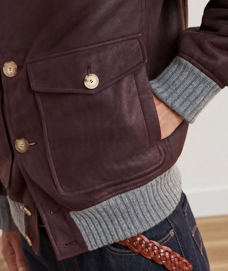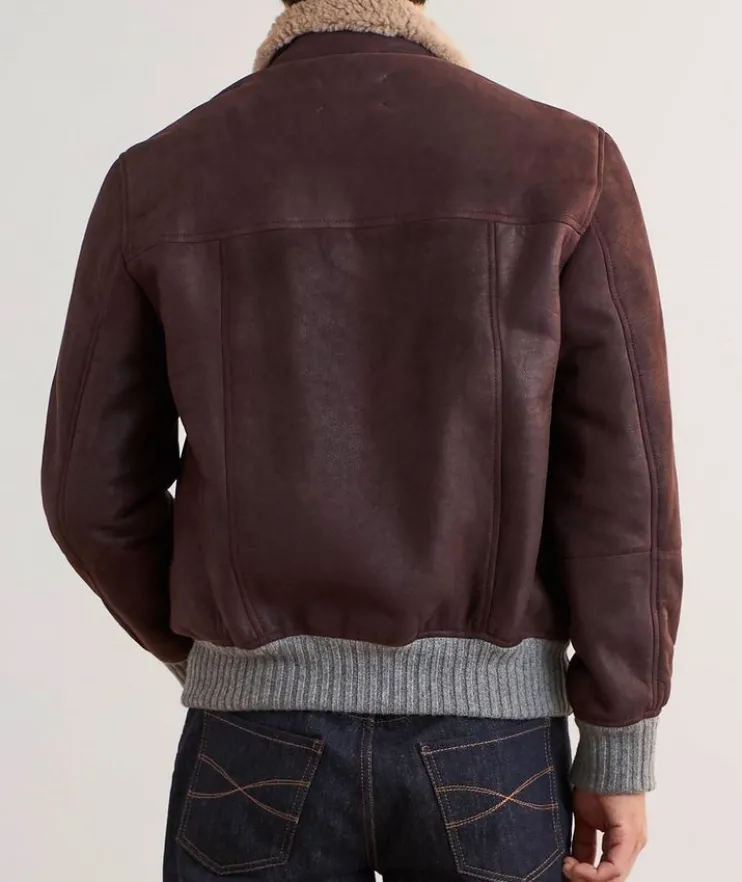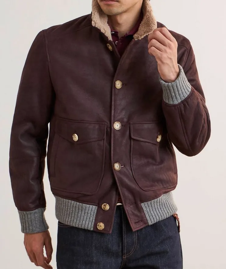 - Expertly crafted in Italy from supple suede with a button closure and front two-way pockets, this classic bomber is enhanced with soft ribbed trim and cozy shearling lining.