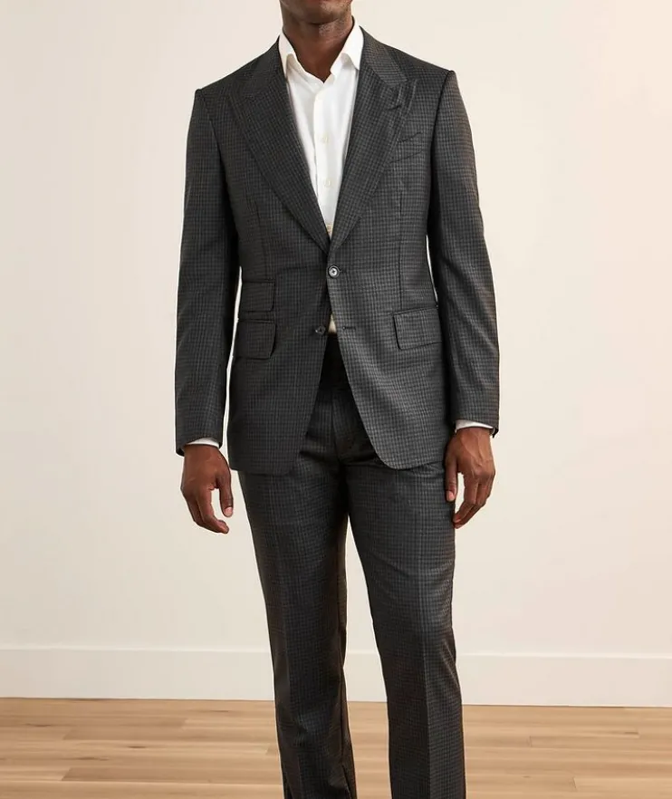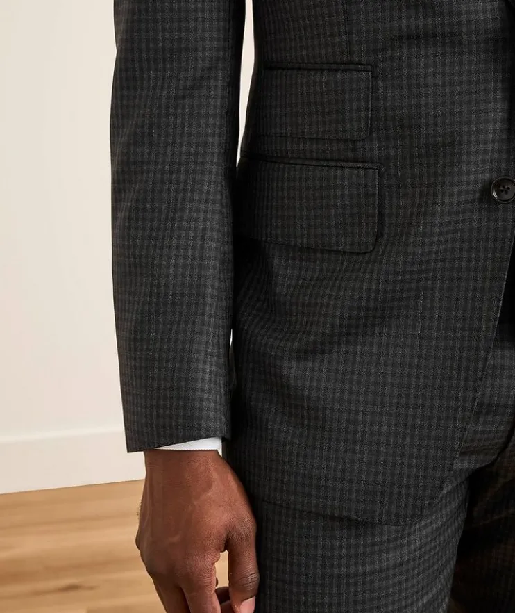 - This suit has been crafted in a slim fit, designed to sit close against the body.