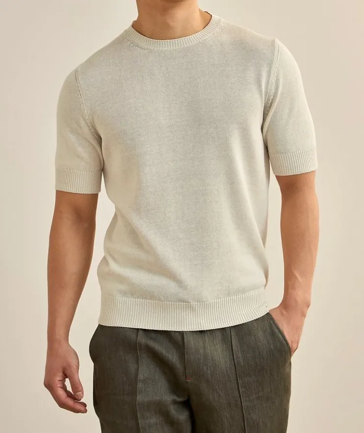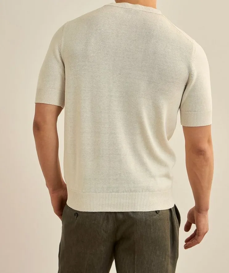 - A sophisticated year-round wardrobe staple, this short-sleeve crewneck can be dressed up or down. The blended silk and linen fibres enrich the luxurious feel of the garment with a soft, fluid body-skimming drape.