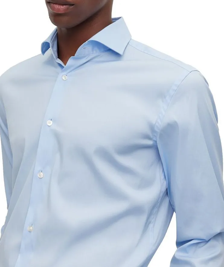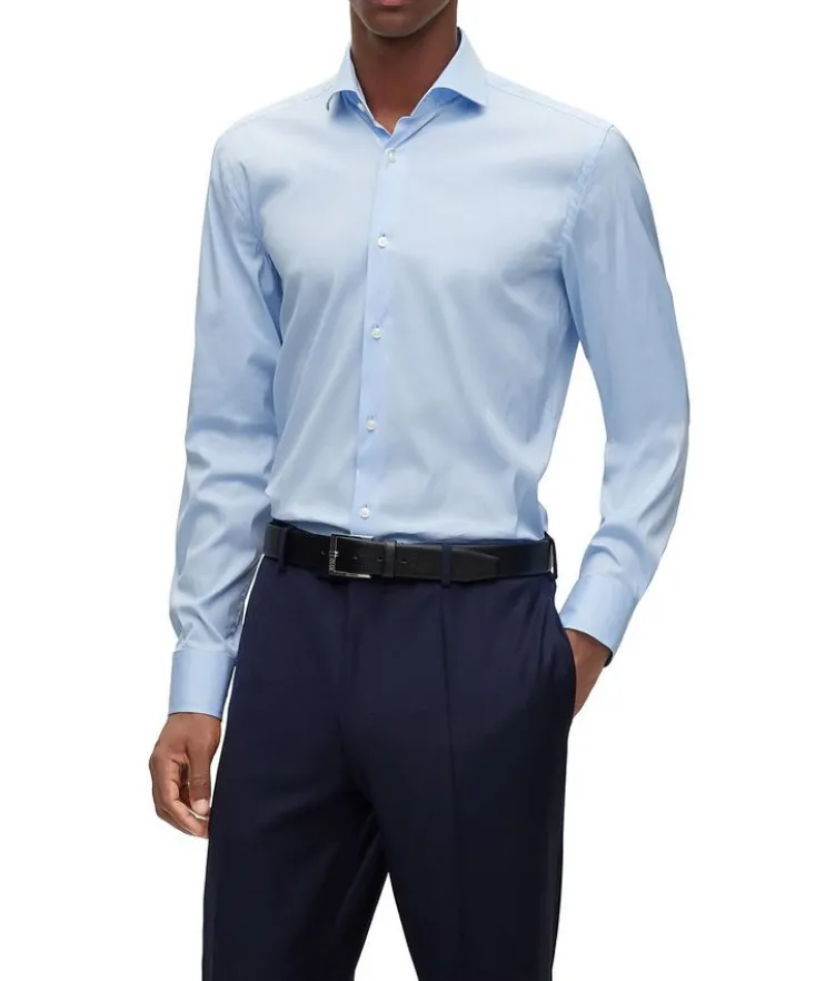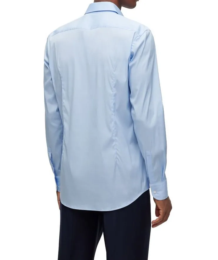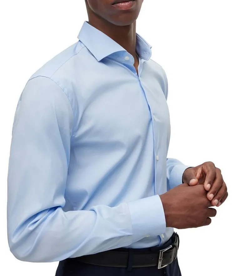 - Effortlessly transition from the office to dinner with friends, with this BOSS dress shirt. Crafted in easy-iron poplin that’s rich in cotton and blended with generous stretch, this shirt is topped with a spread collar featuring piping at the interior for subtle added character. Simple yet sophisticated, this dress shirt is the perfect option for contemporary workwear and looks alike.