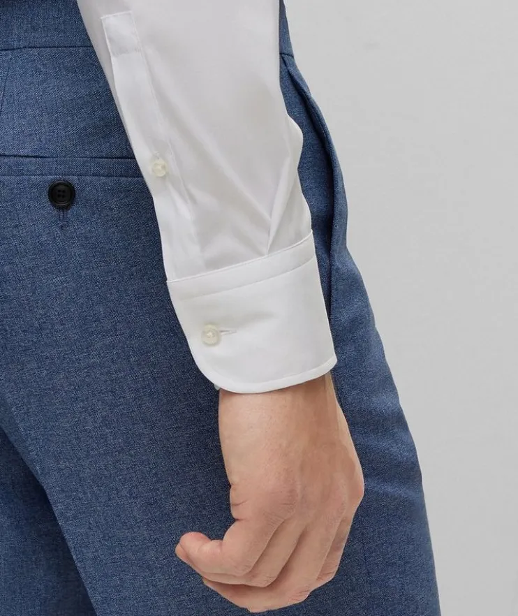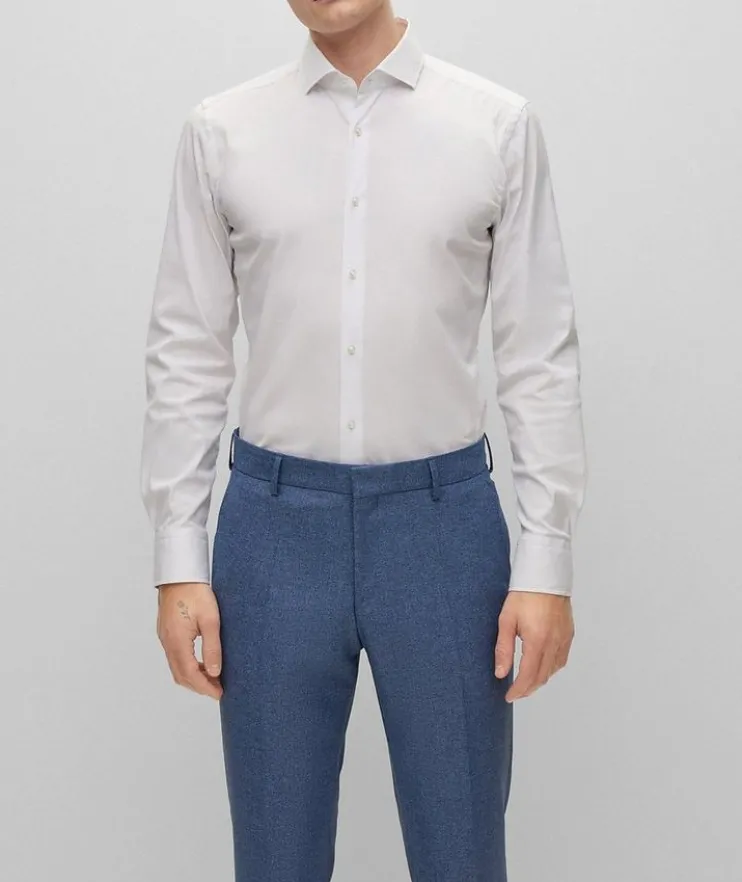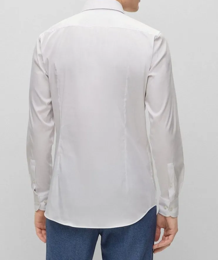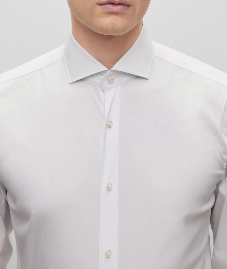 - Effortlessly transition from the office to dinner with friends, with this BOSS dress shirt. Crafted in easy-iron poplin that’s rich in cotton and blended with generous stretch, this shirt is topped with a spread collar featuring piping at the interior for subtle added character. Simple yet sophisticated, this dress shirt is the perfect option for contemporary workwear and looks alike.