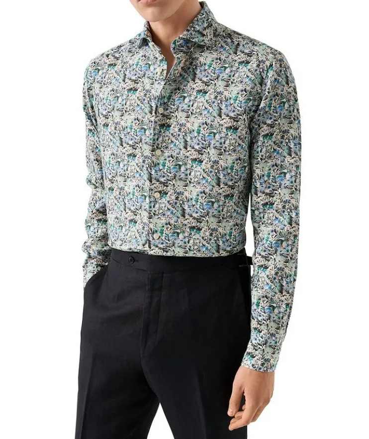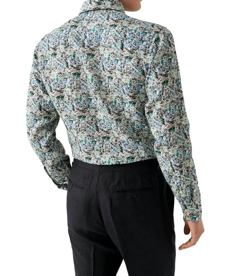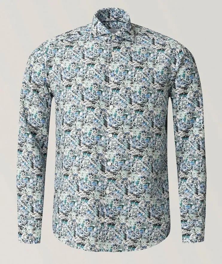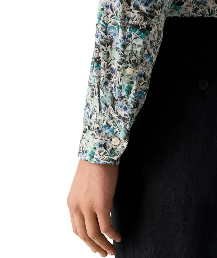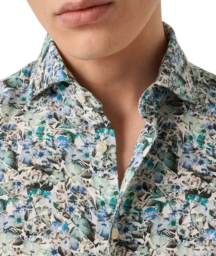 - A classic linen shirt with an elegant floral mosaic pattern in a palette of muted blues, grays and greens. The beautiful print is inspired by the artworks in Antoni Gaudí’s Park Güell in Barcelona, and the shirt is cut from 100% linen fabric for a timeless summer drape.