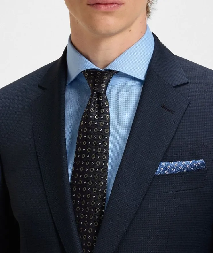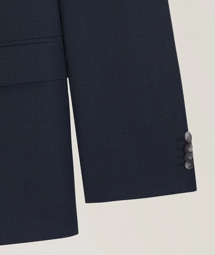 - Exquisitely tailored for the modern gentleman, this distinguished suit showcases impeccable craftsmanship. Cut to a defined fit with constructed shoulders, this suit is crafted in virgin wool for a rich look with natural stretch. Finished with classic details and a subtle pattern is easy to style with any shirt and tie.