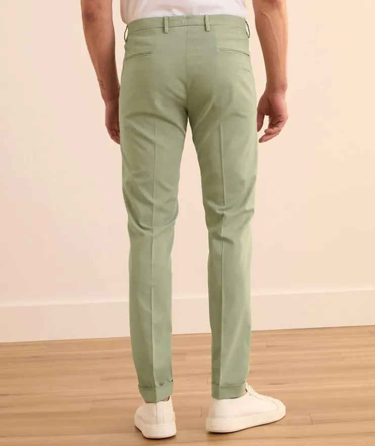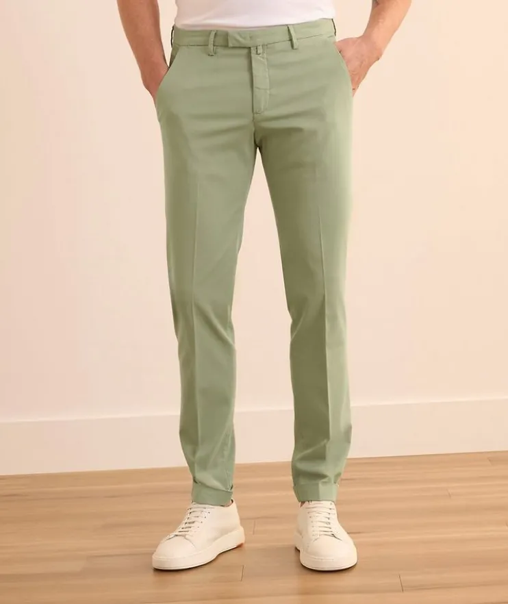 - Expertly made in Italy, these flat front chinos are tailored in a comfortable stretch cotton fabrication and cut to a slim fit with modern cuffed hems.