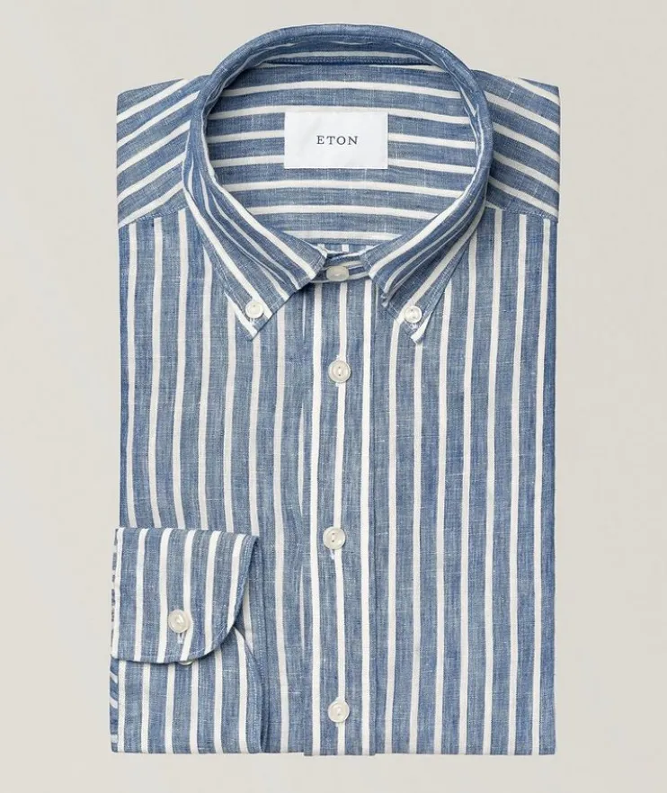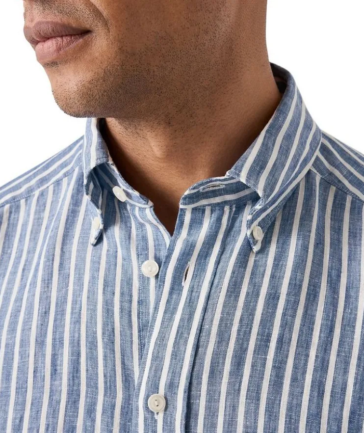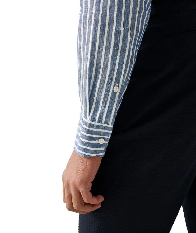 - A classic long-sleeve linen shirt in an uplifting colour featuring a bold white stripe to give your look a contemporary twist. The texture and lightweight weave of the linen offers exceptional comfort and breathability, while the piece is garment washed for extra softness.