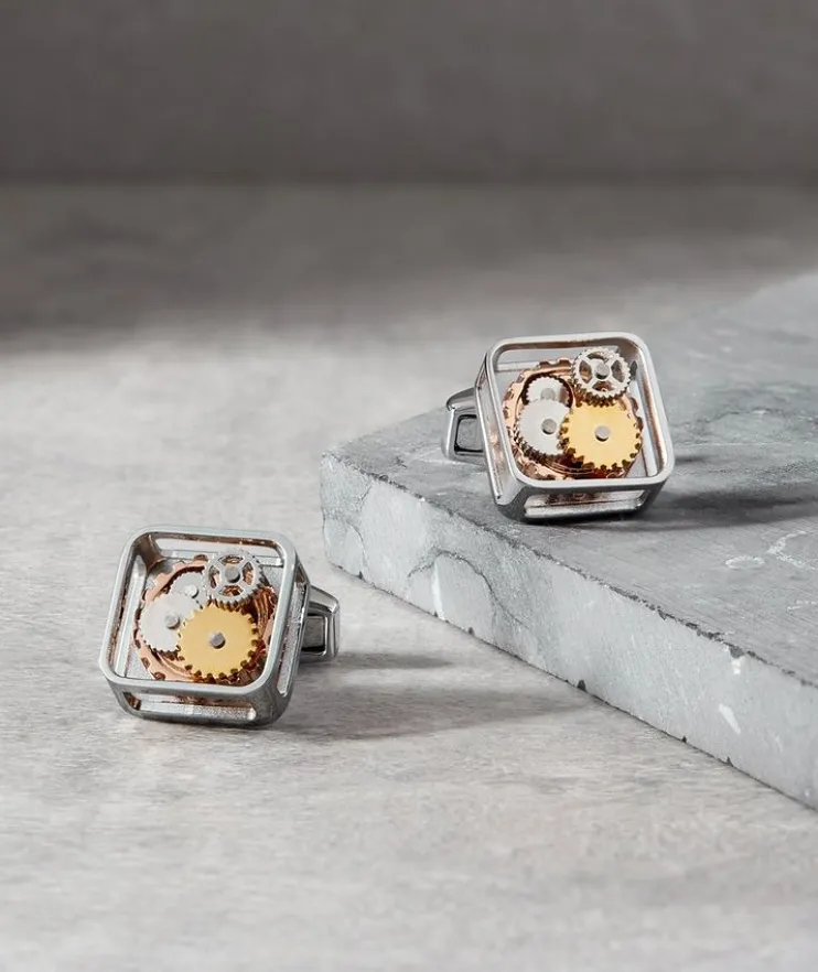 - From Robert Tateossian’s Mechanical collection comes a set of novel cufflinks of Gears. Framed in an open square, you manually move the cogs & gears of varying metal finishes.