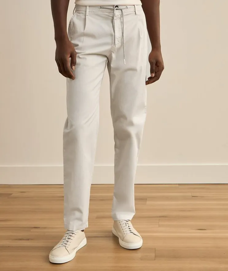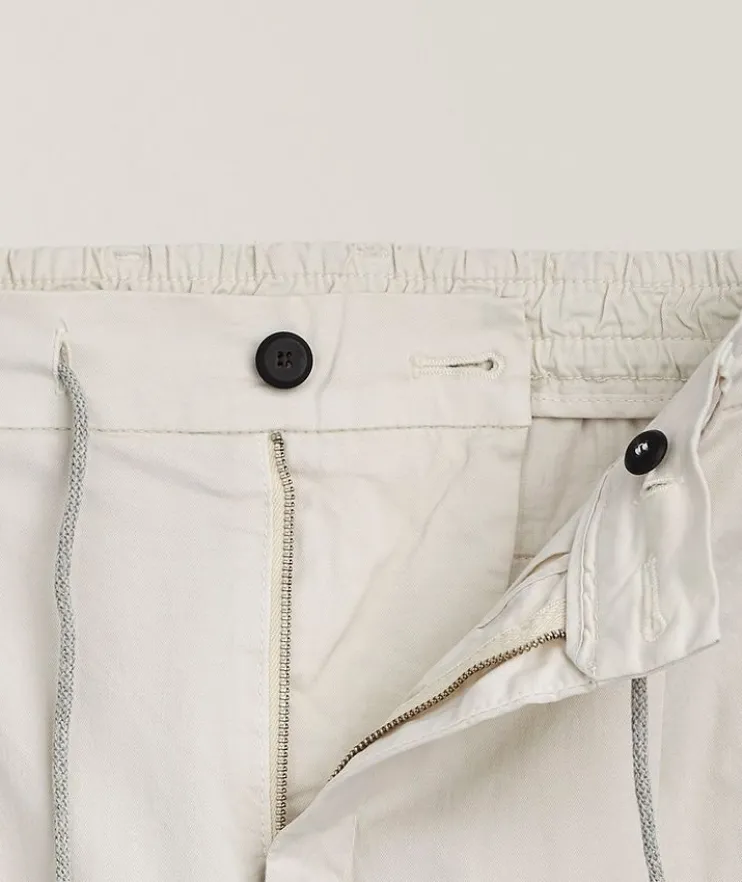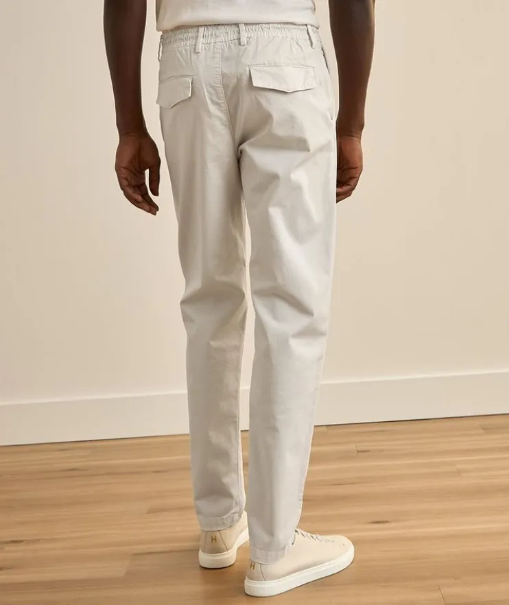 - Cut in a tapered silhouette with an elasticized back and drawstring detailing, these stretch cotton pants elevate any casual outfit.