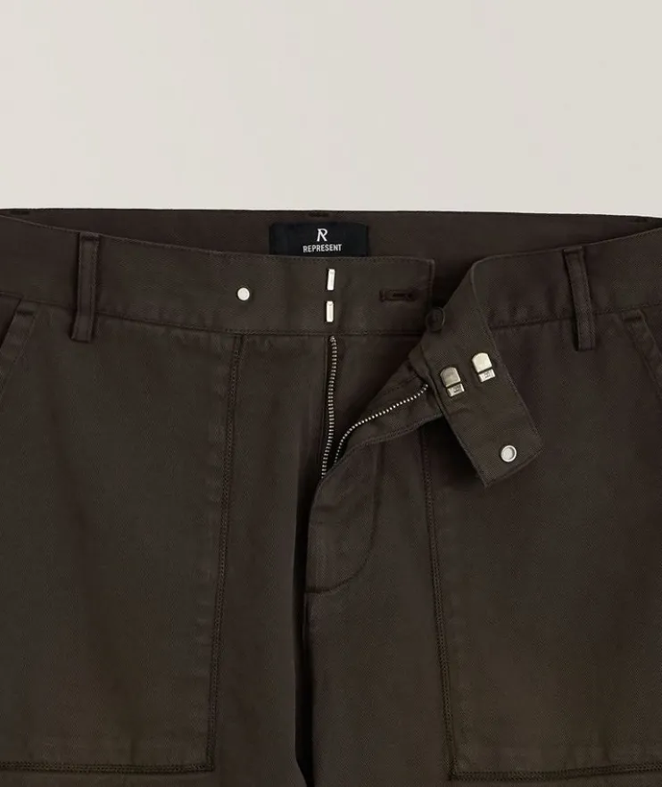 - Crafted from rich cotton with a slight stretch, these pants feature three-dimensional cargo pockets, slip pockets and hand pockets with metal rivet hardware throughout. Tailored for a relaxed straight fit, these elevated casuals are finished with a yoke to the back for garment shaping.