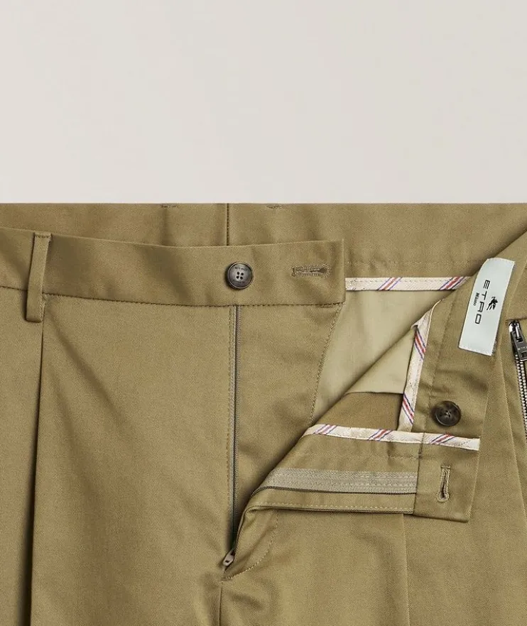 - Zippered side pockets add a modern element to these versatile stretch-cotton pants. Pleated details at the front add dimension and help to create a flattering silhouette.