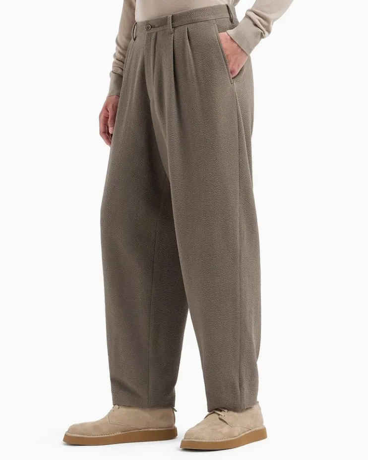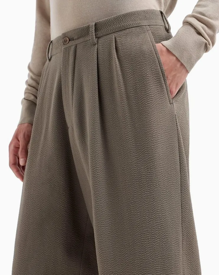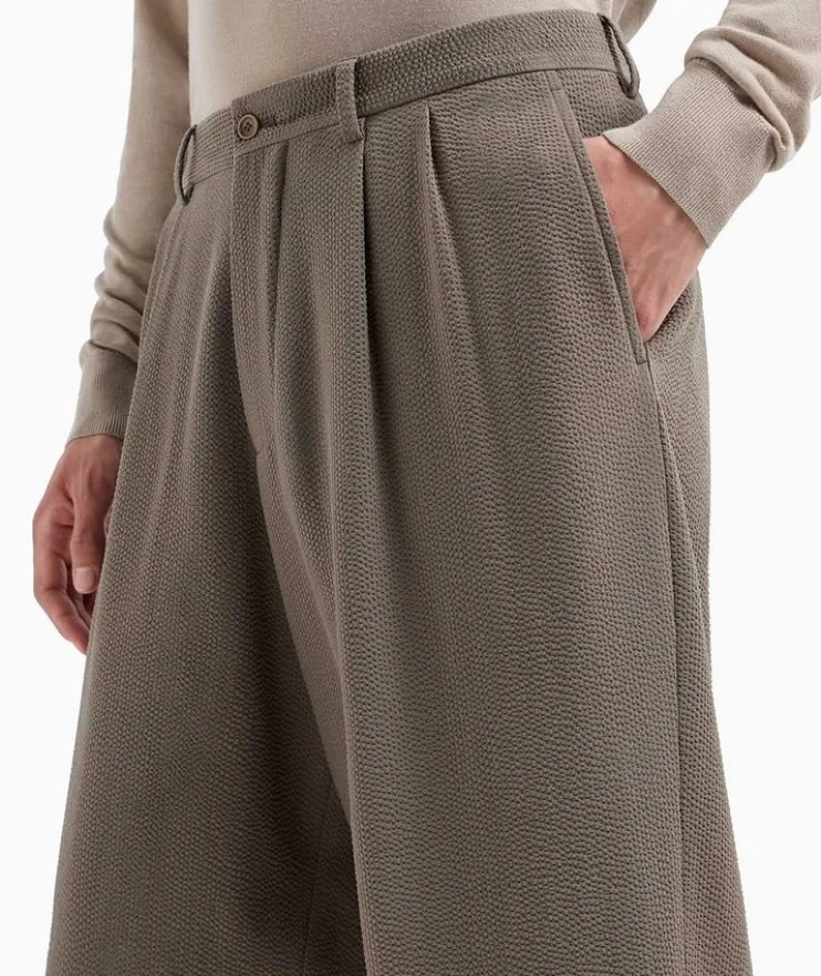 - A timeless and sophisticated addition to any gentleman’s wardrobe, these pants are crafted from a wool blend with subtle stretch in a seersucker finish with double pleated detailing for a flattering fit.