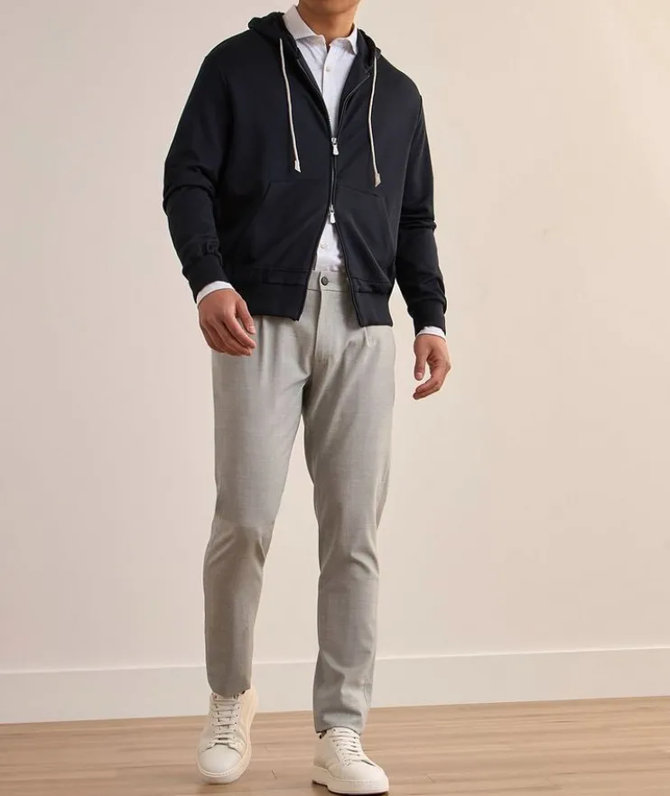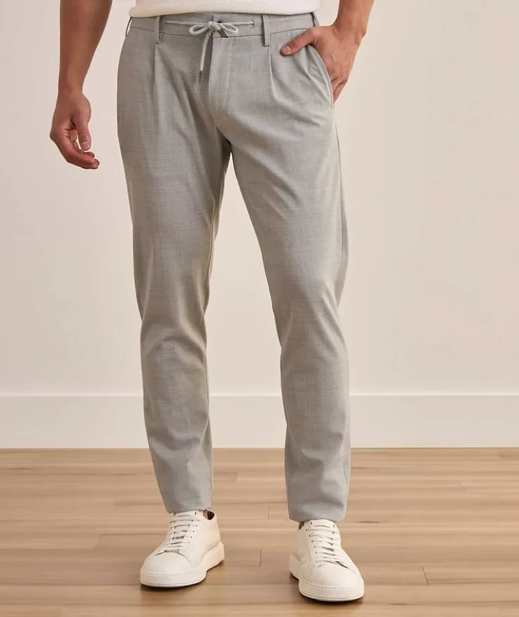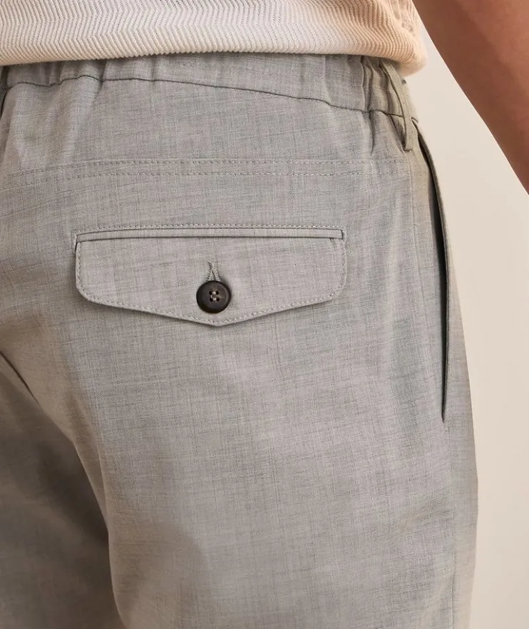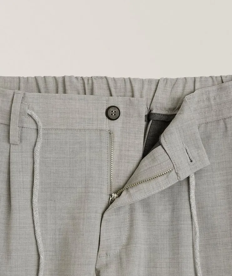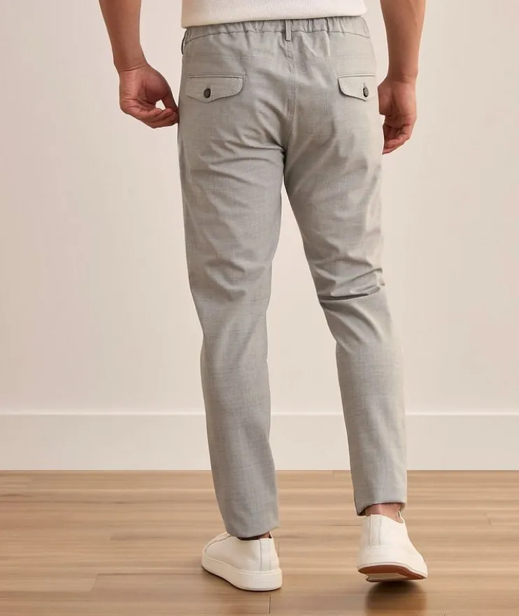 - A combination of classic and casual style, these tailored pants feature an elasticized waist with drawstring detailing for a modern appeal. Finished in a wool blend with stretch for all day comfort.