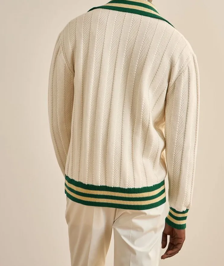 - A cozy cable-knit sweater in a breathable wool-cotton blend and updated with contemporary details, like contrasting stripes and a full zipper closure.