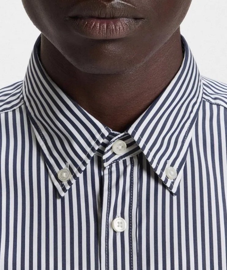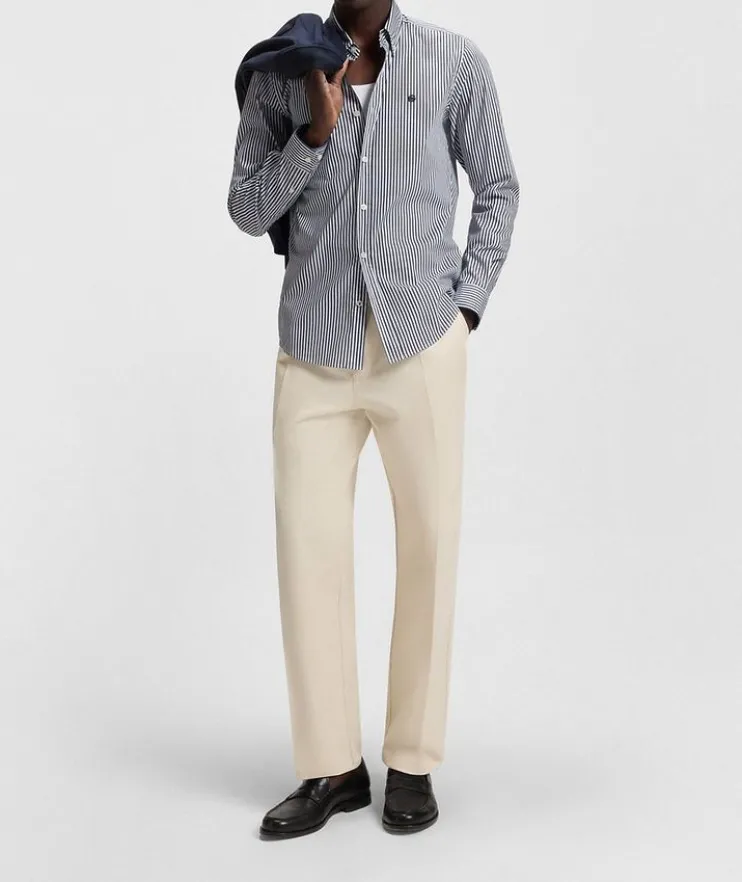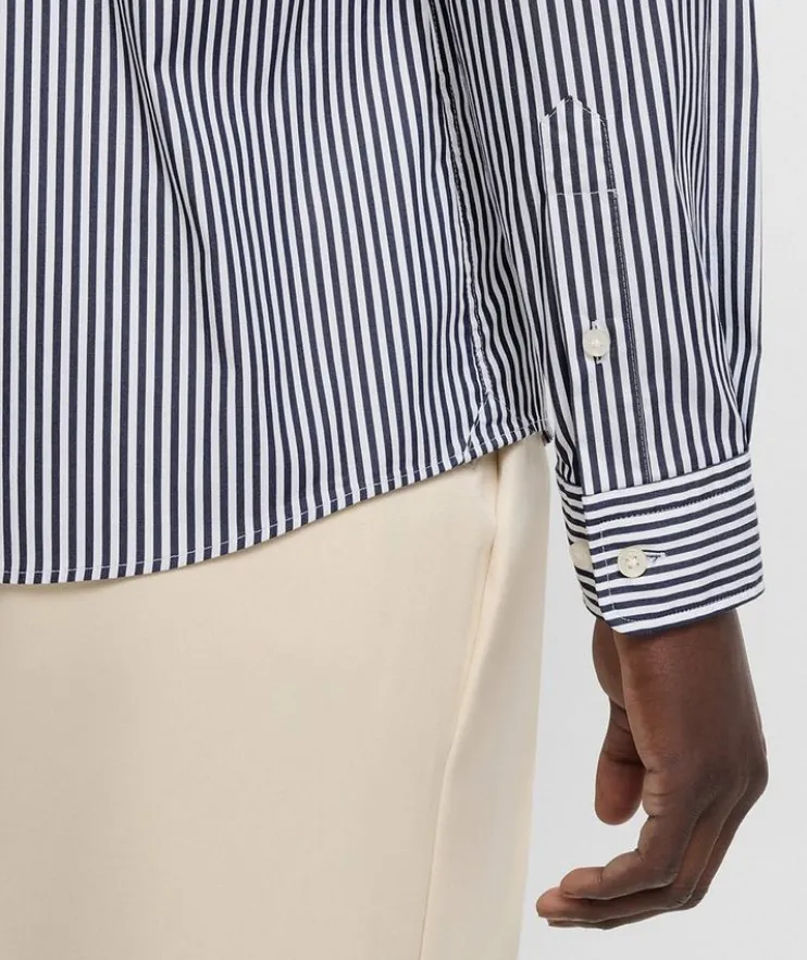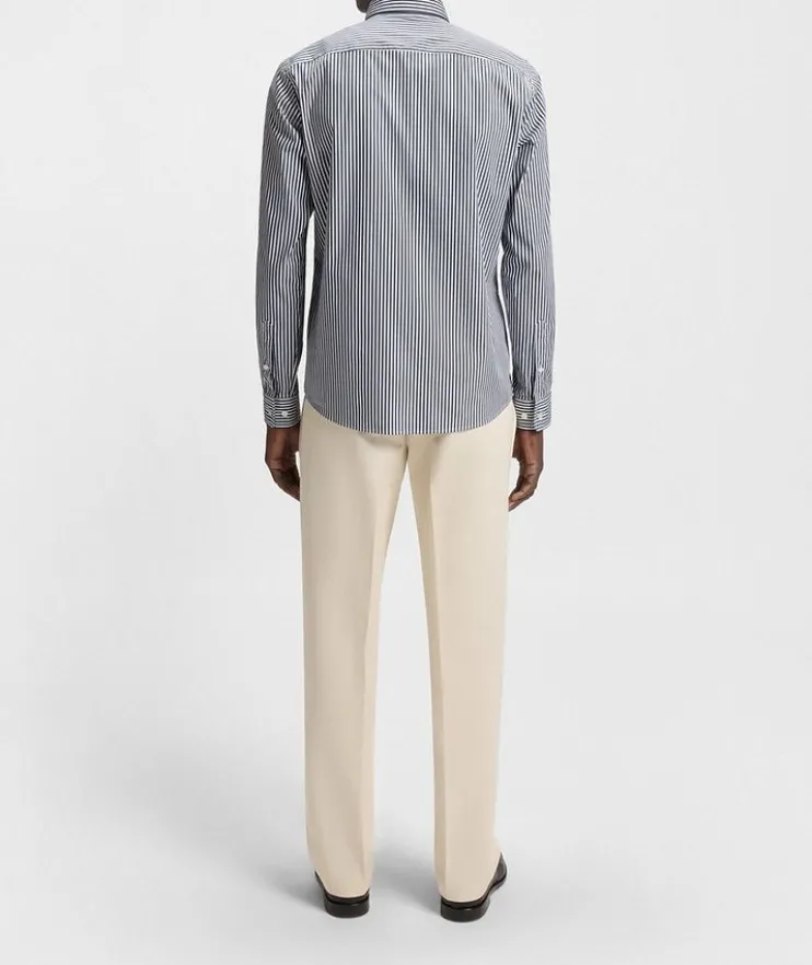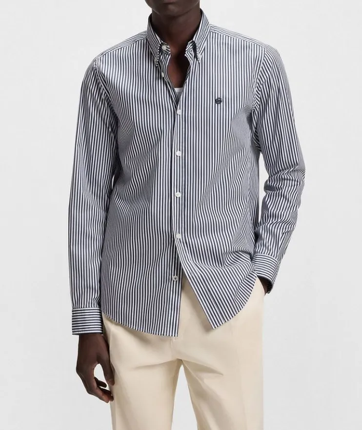 - With a modern stripe and slim fit, this button-down shirt is a casual essential in any gentleman’s wardrobe. Crafted from a cotton-blend satin with generous stretch and the brand’s double ‘B’ monogram detail.