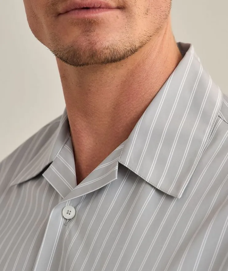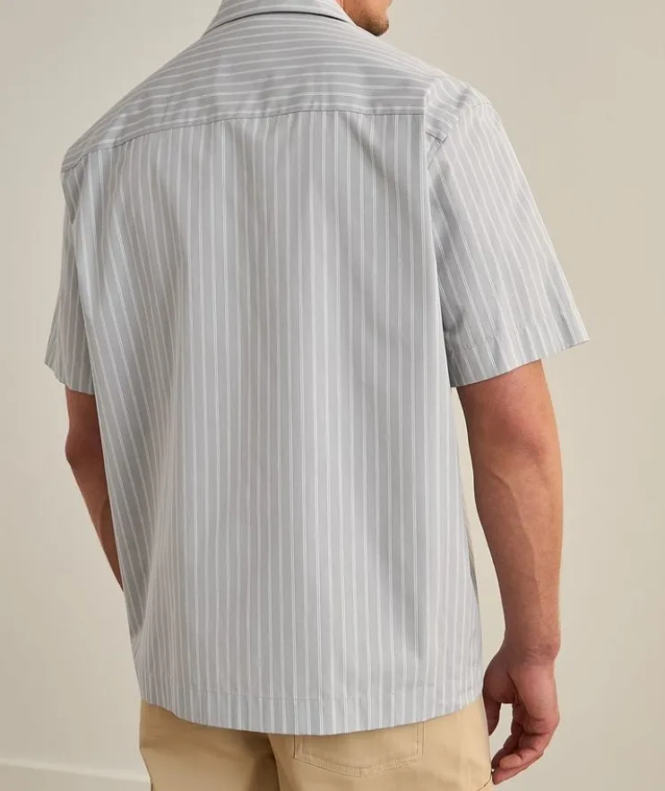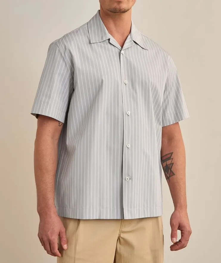 - This short-sleeved camp-style shirt boasts a classic striped design and is constructed from breathable cotton with clean lines in a relaxed fit for a casual, modern appeal.