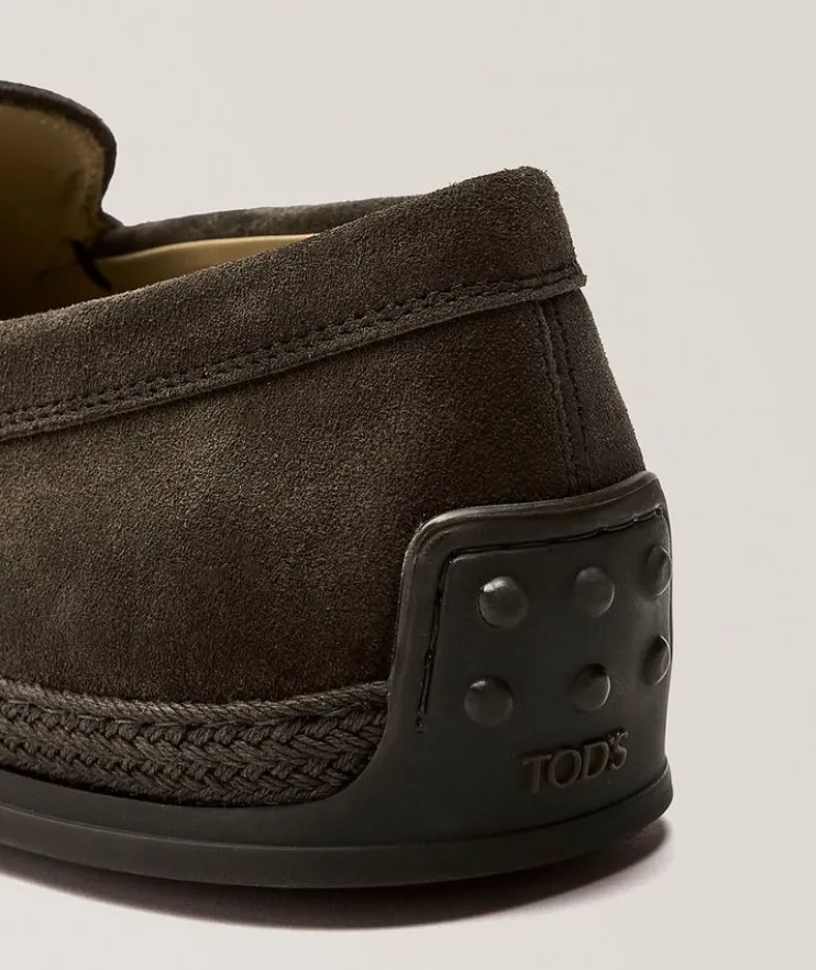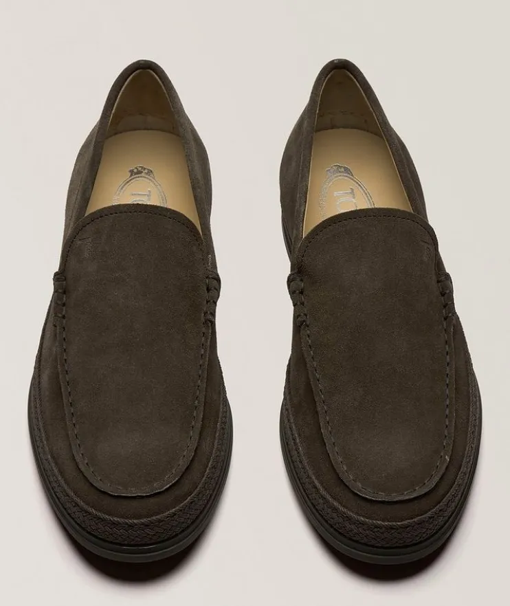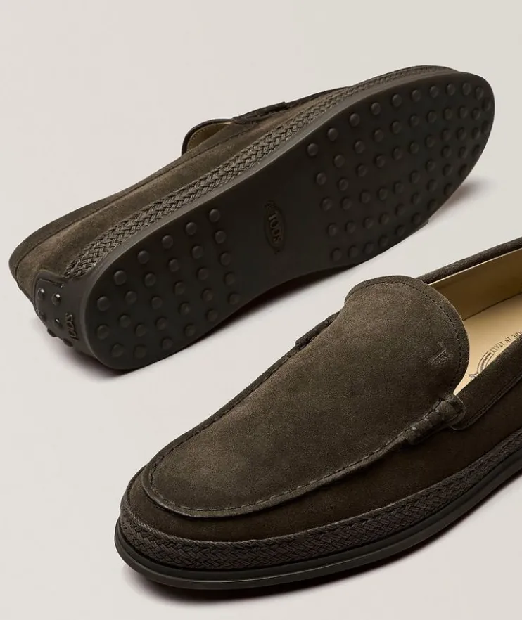 - Exposed stitching and tonal espadrilles detailing lend a casual element to these velvety smooth suede loafers. Perfect for the office or dressing up a casual look.