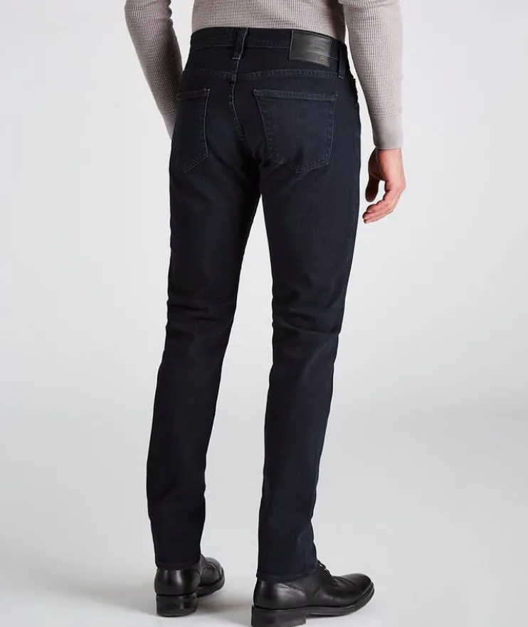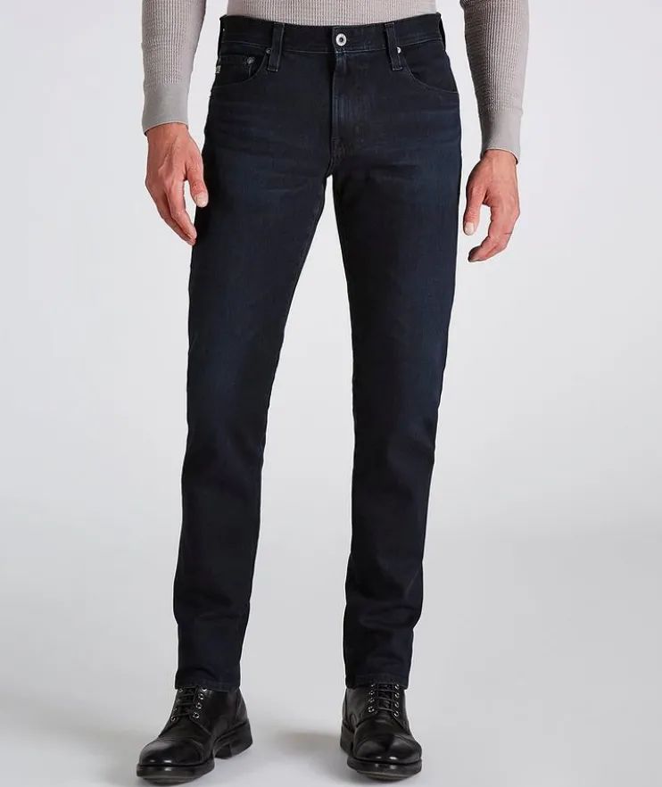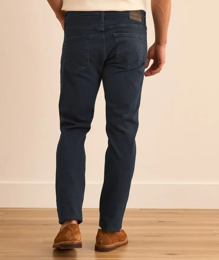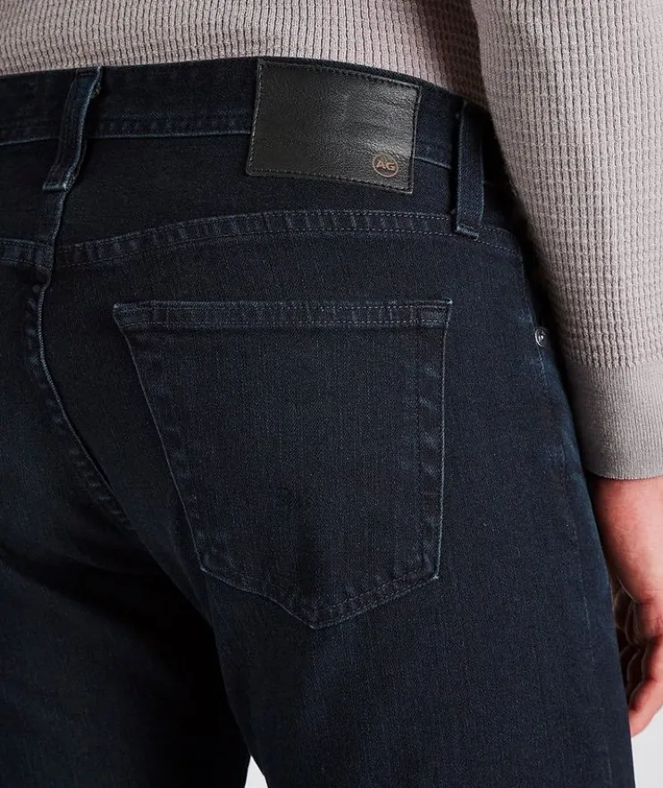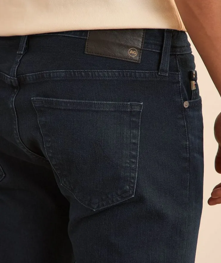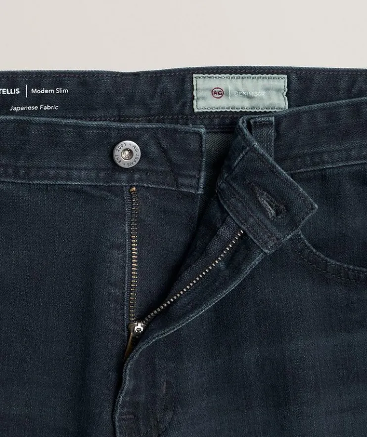- These AG Tellis jeans are crafted from premium Japanese stretch denim, making them the perfect wardrobe go-to for the modern man. Dyed in dark blue and treated with their fade-proof finish, the five-pocket pair features a mid-rise waist with a modern slim fit and a tapered leg opening. The closet essential pairs well with anything from casual t-shirts and laid-back sneakers, to sport shirts and Derby shoes.