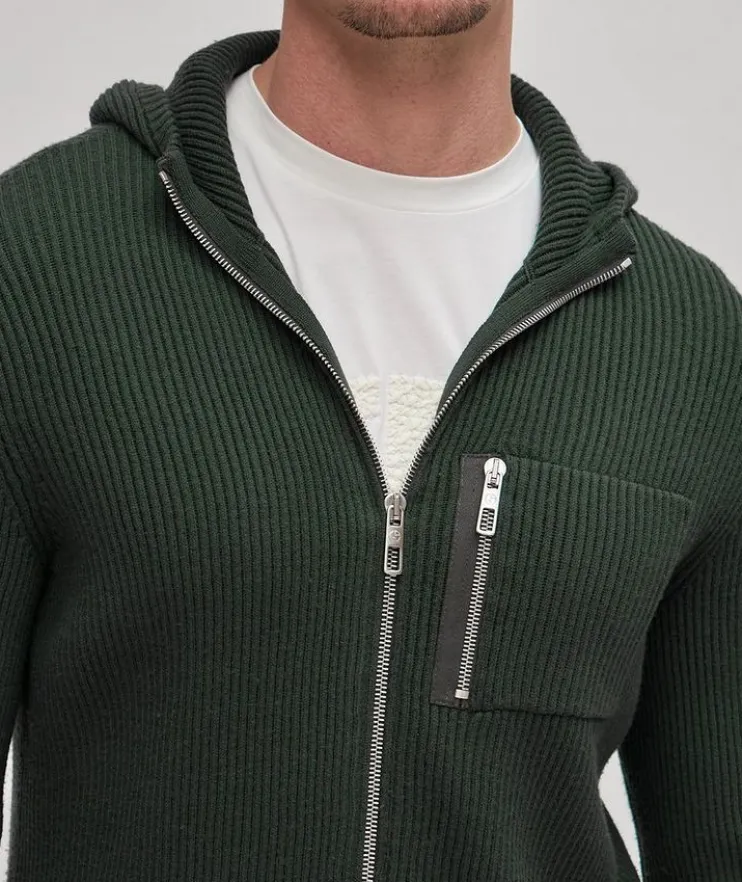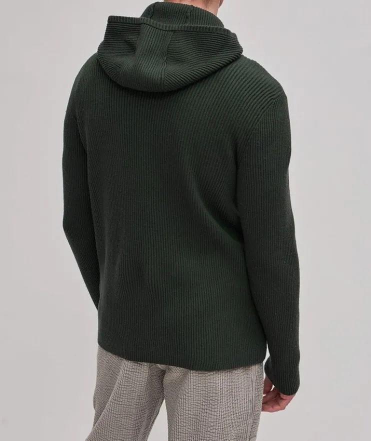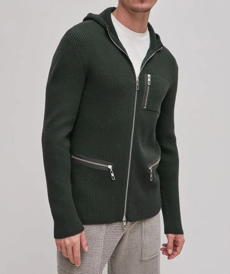 - Turn heads with this sweater by Giorgio Armani. Crafted from pure virgin wool, this textured rib-knit sweater features an array of zipper pockets to add a sense of movement to this daytime urban style. The soft hood creates the possibility for this garment to be dressed up or down to complete your desired look.