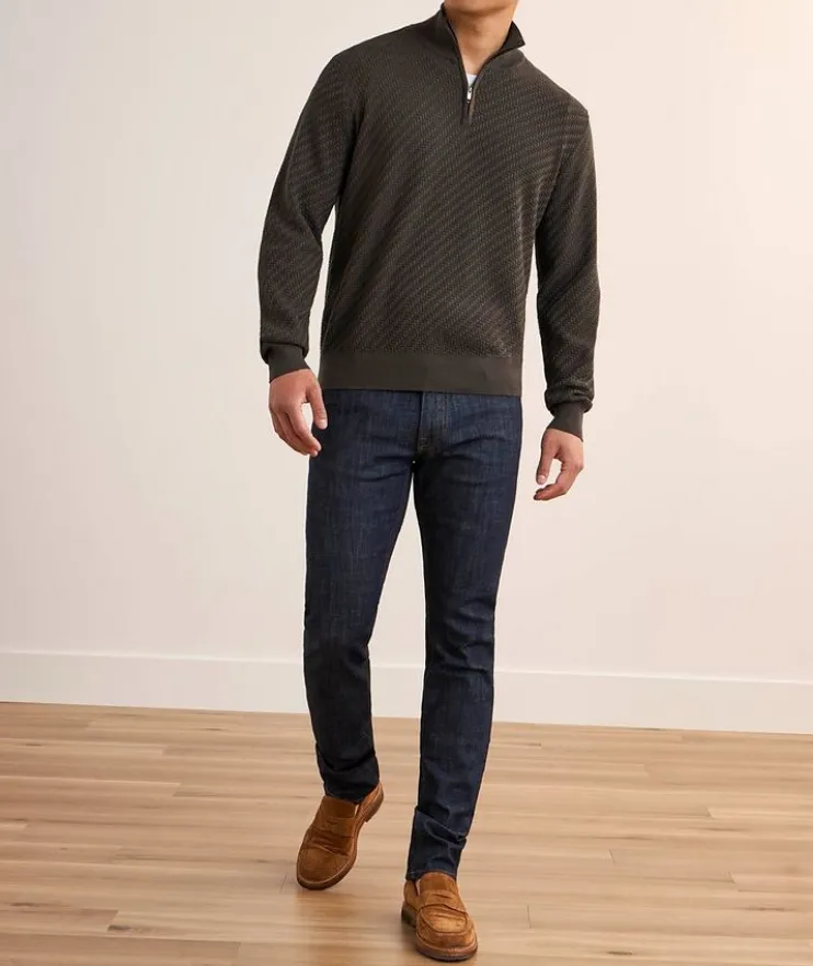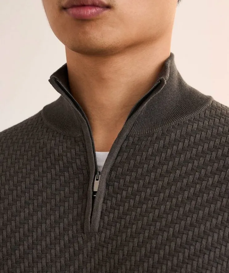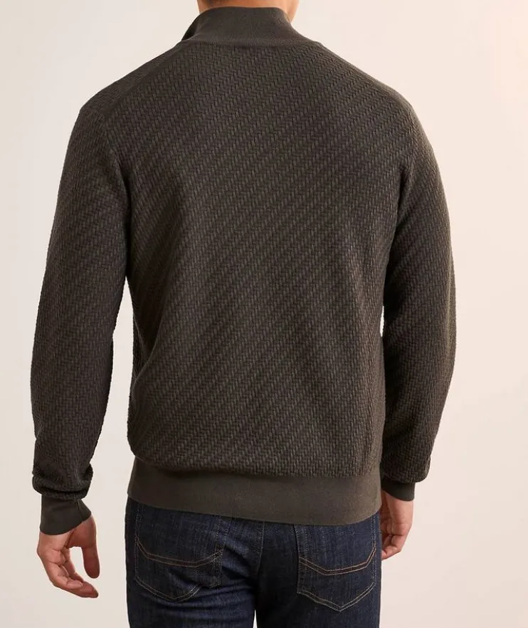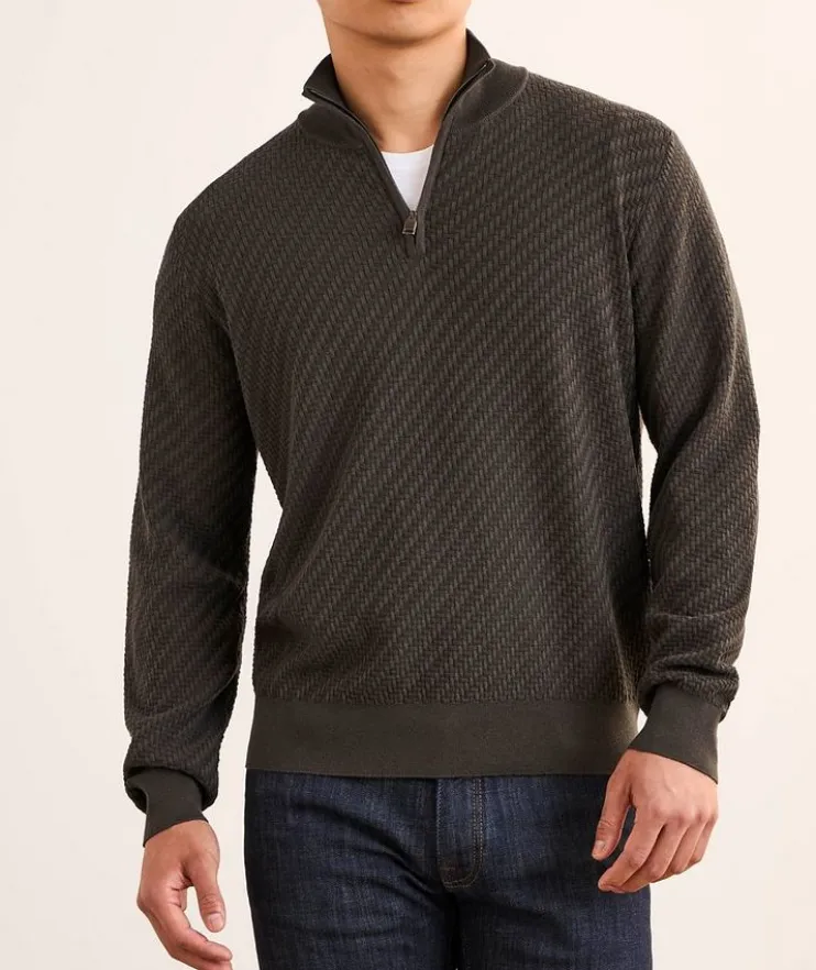 - Beautifully crafted from a blend of cotton, silk and cashmere, this lightweight sweater feature’s the brand’s Trama-weave knit, a tone-on-tone pattern that mimics the San Pietrini, the cobbled stones characterizing the streets of Rome. Finished with ribbed trim and a quarter-zipper closure for a modern and refined look.