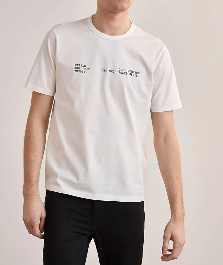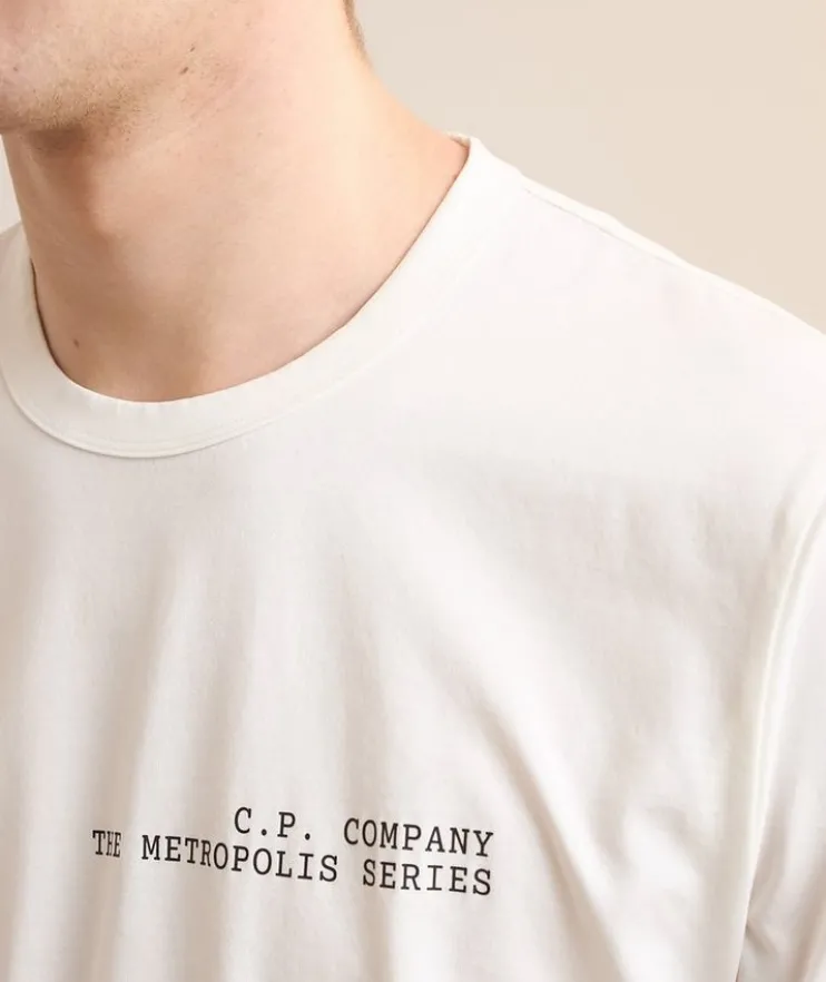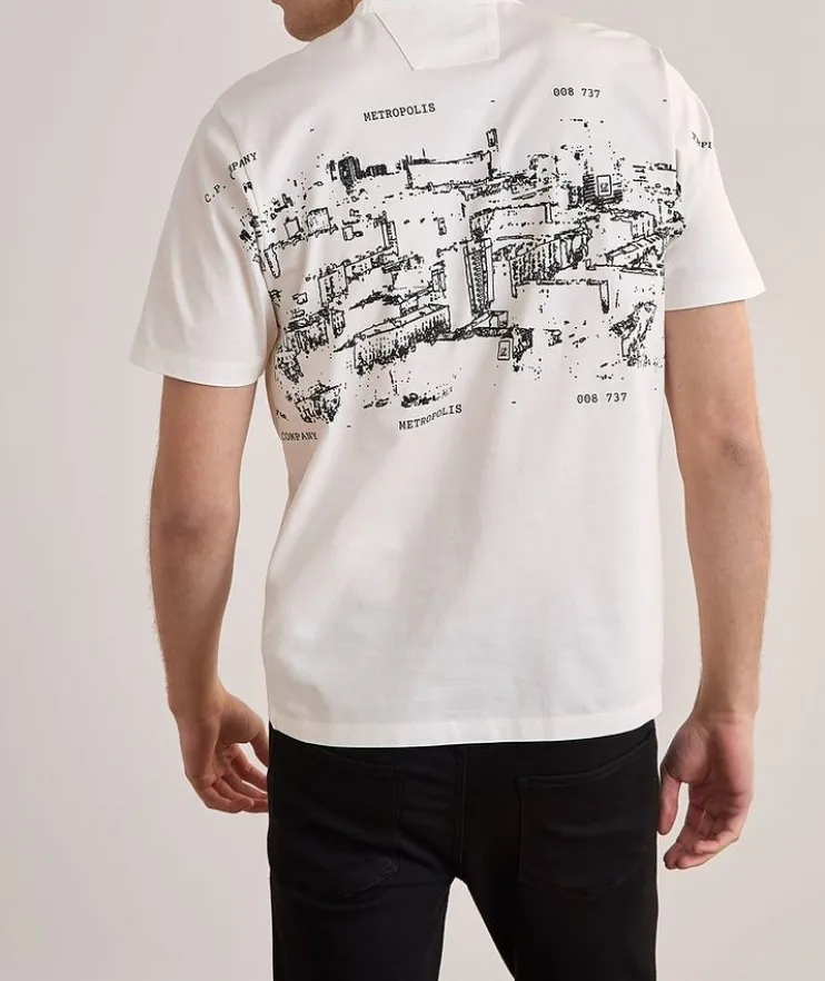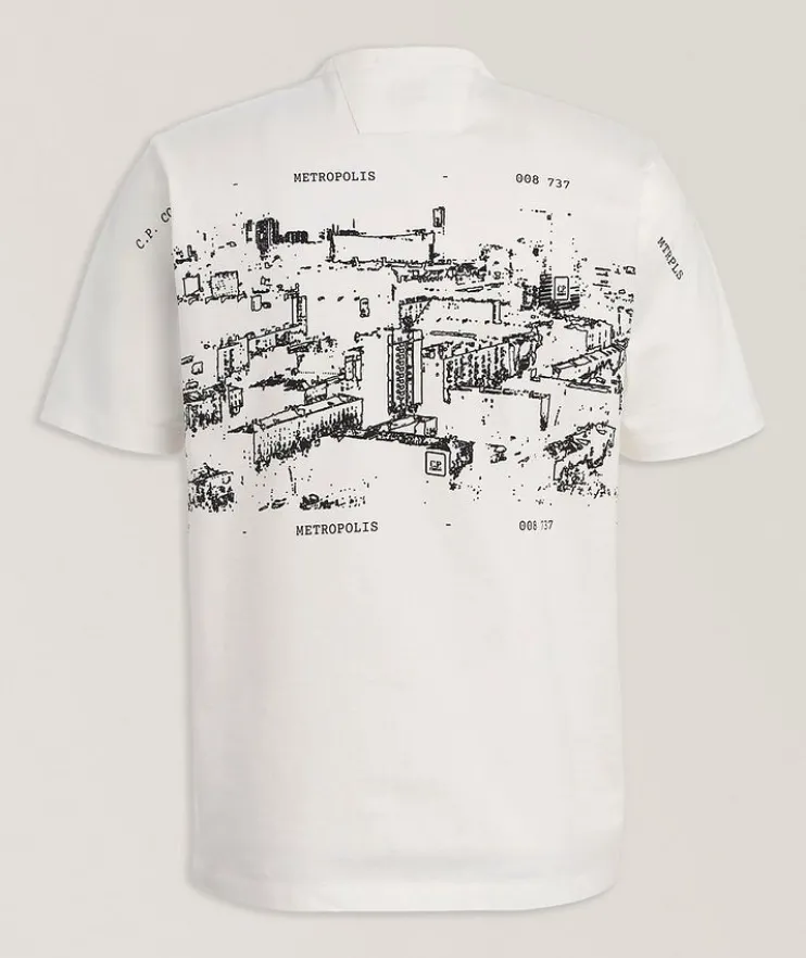 - From the Metropolis Series. This classic crewneck T-shirt is modernized with metropolis-inspired graphic prints from front to back to create a contemporary and edgy aesthetic. Finished in mercerized cotton jersey for a refined look.