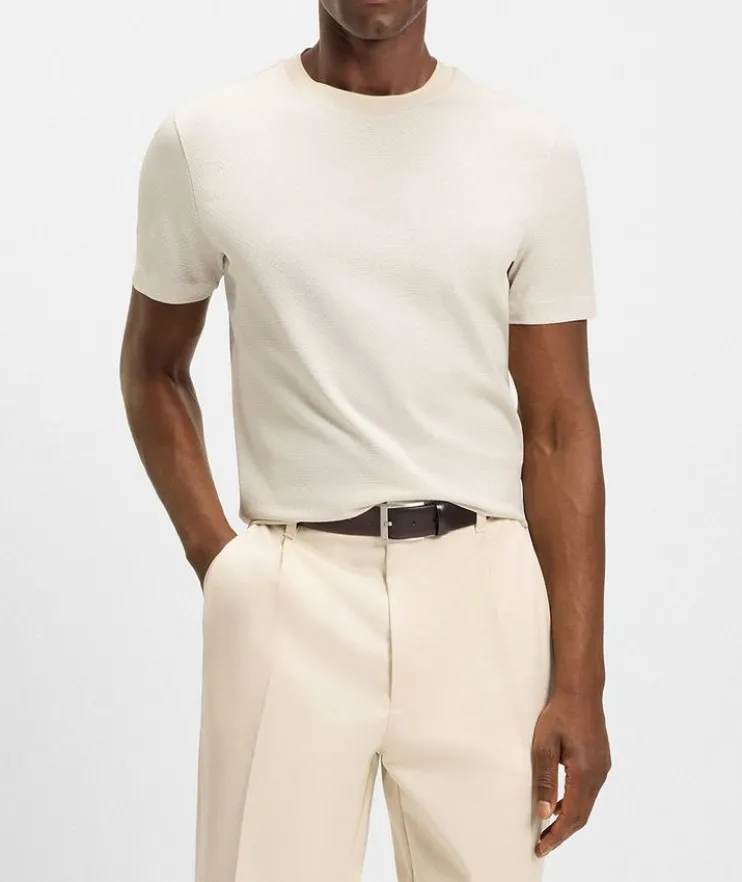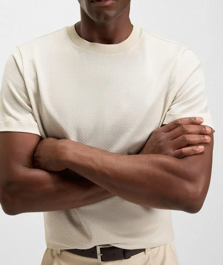 - An elevated basic in any wardrobe, this crewneck T-shirt features a woven geometric jacquard design in mercerized cotton for super-soft comfort. Finished in a straight fit for a casual silhouette.