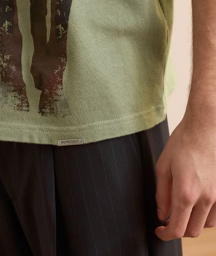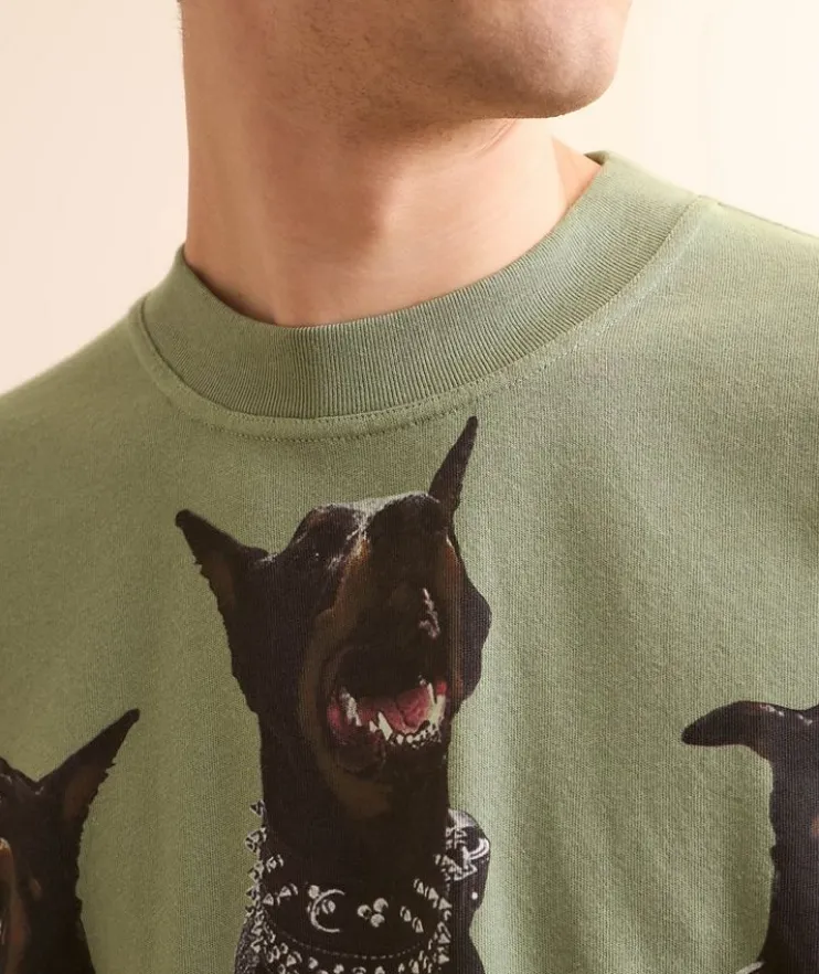 - A slightly oversized t-shirt crafted from medium weight jersey cotton, this drop-shoulder design features a graphic print and metal bar logo on the front for a signature look.