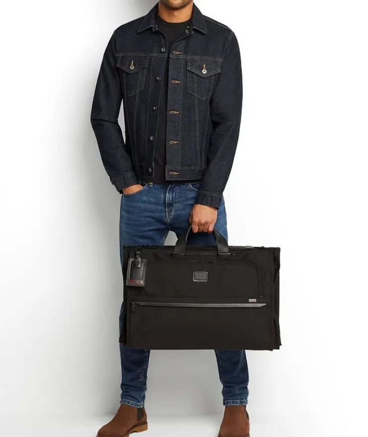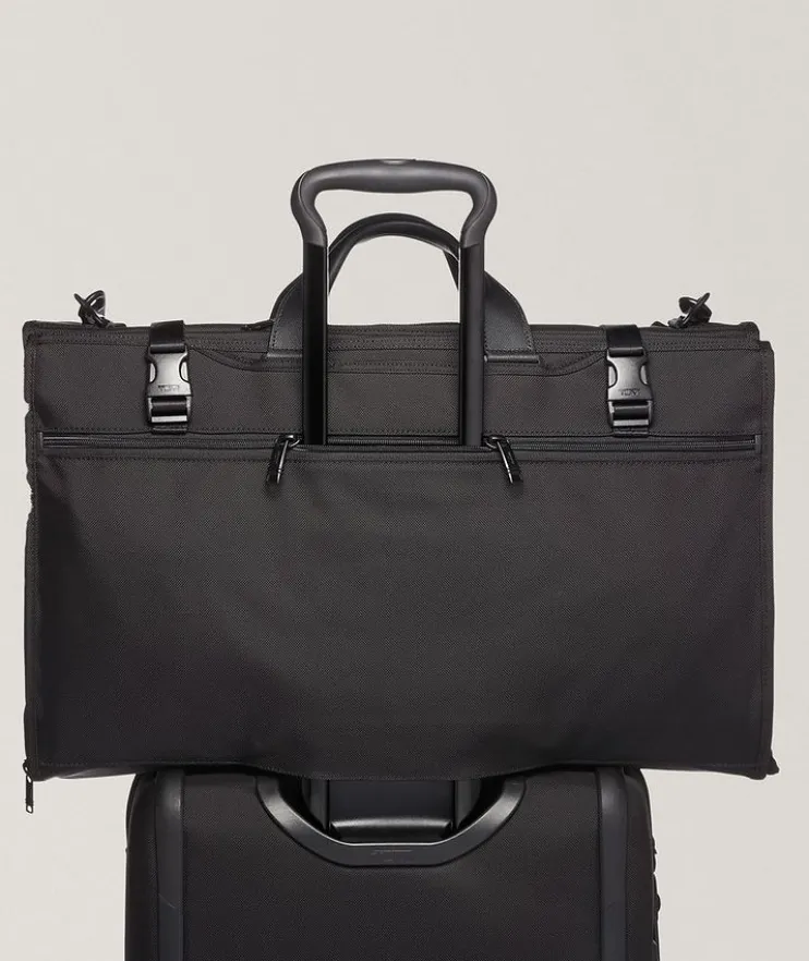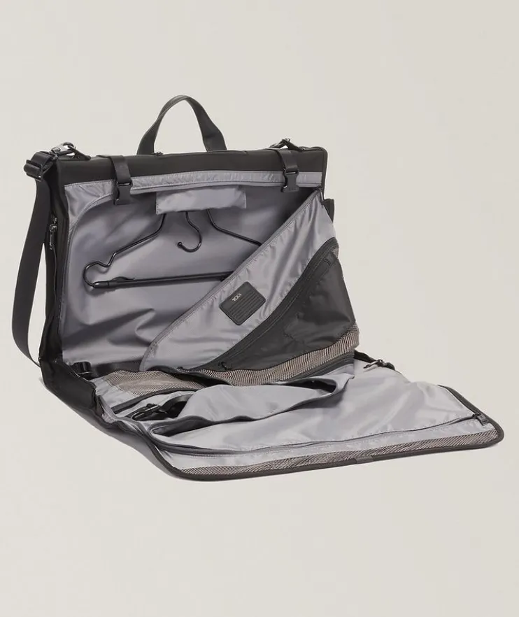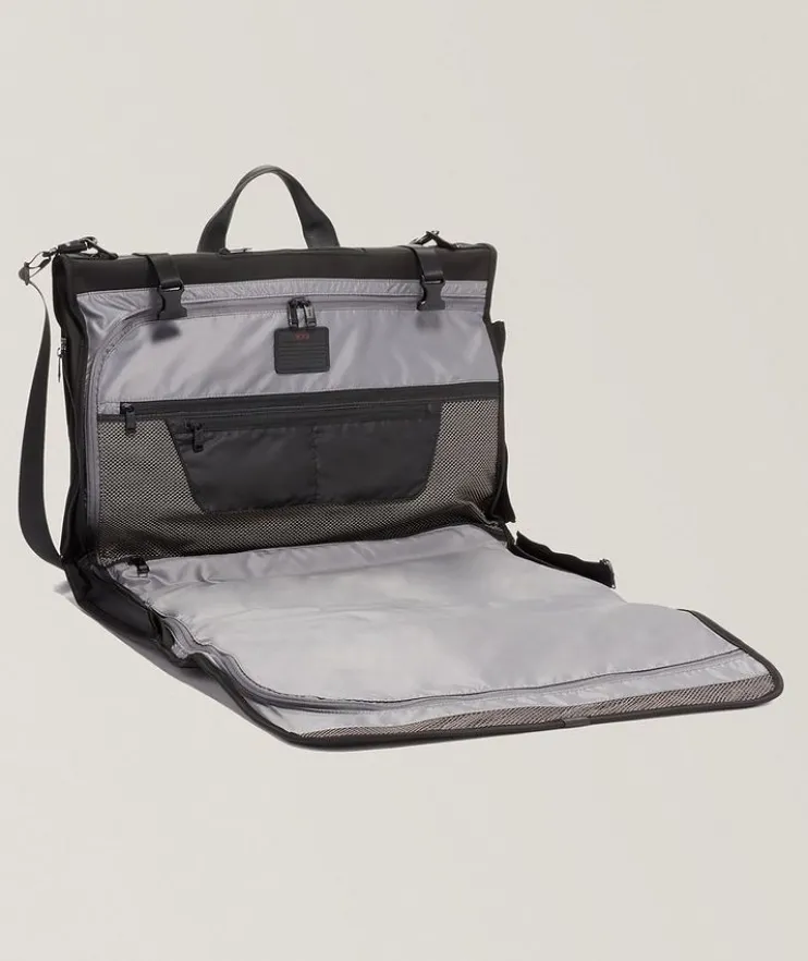 - This Tumi garment bag is a compact and convenient way to safely store up to two suits. The carry-on design features a multitude of pockets for your travel essentials. The zippered interior features tie-down strap and wrinkle guards to keep your garments in place. Carry it by the leather top handles or padded, removable shoulder strap.