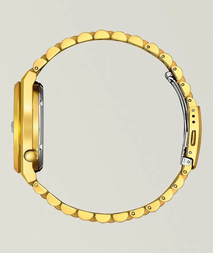 - Goldtone stainless steel case and bracelet