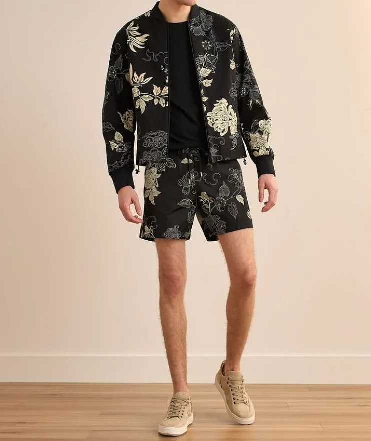 - This contemporary bomber jacket features a reversible design with one side in a printed floral and the other solid. Designed for milder weather, this jacket is crafted with a water-repellent finish.