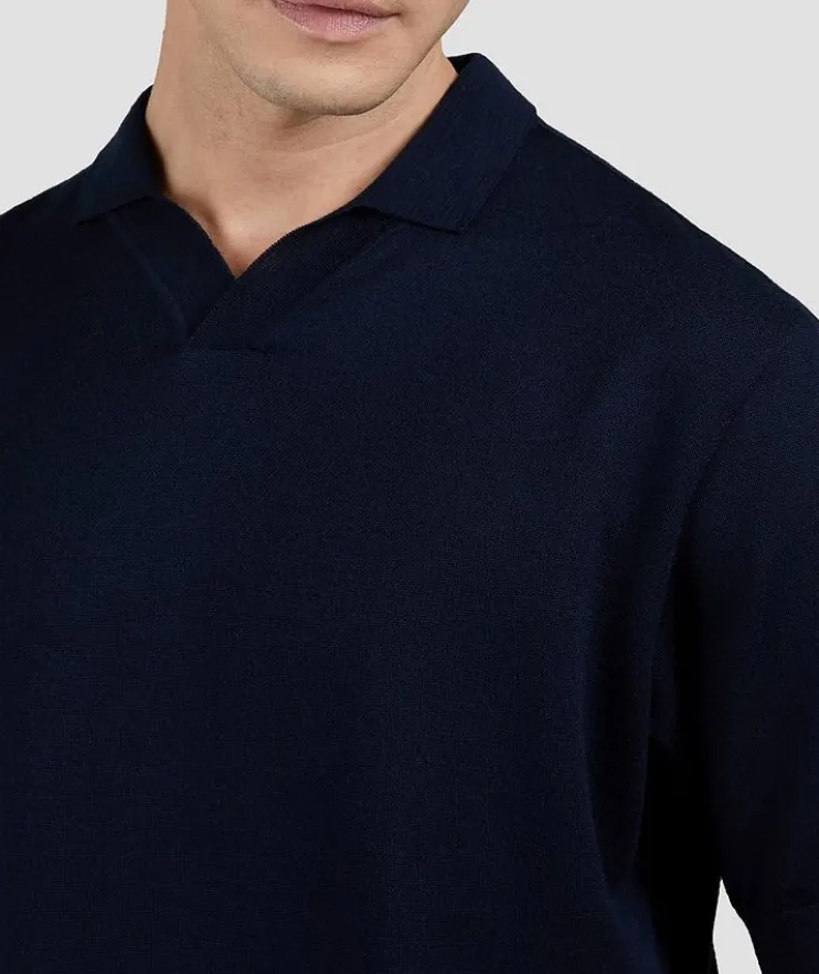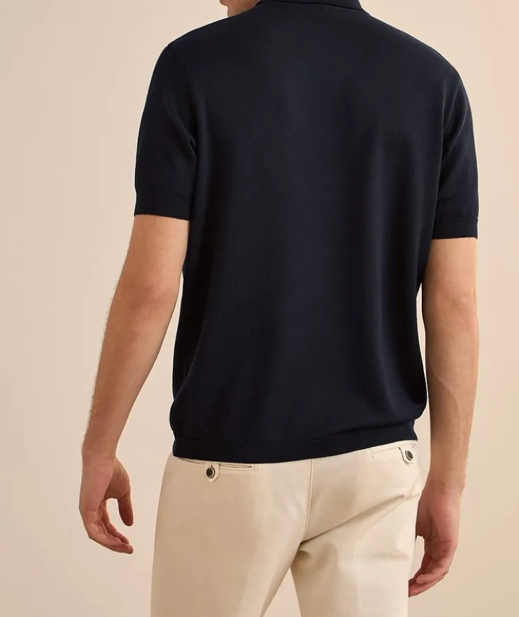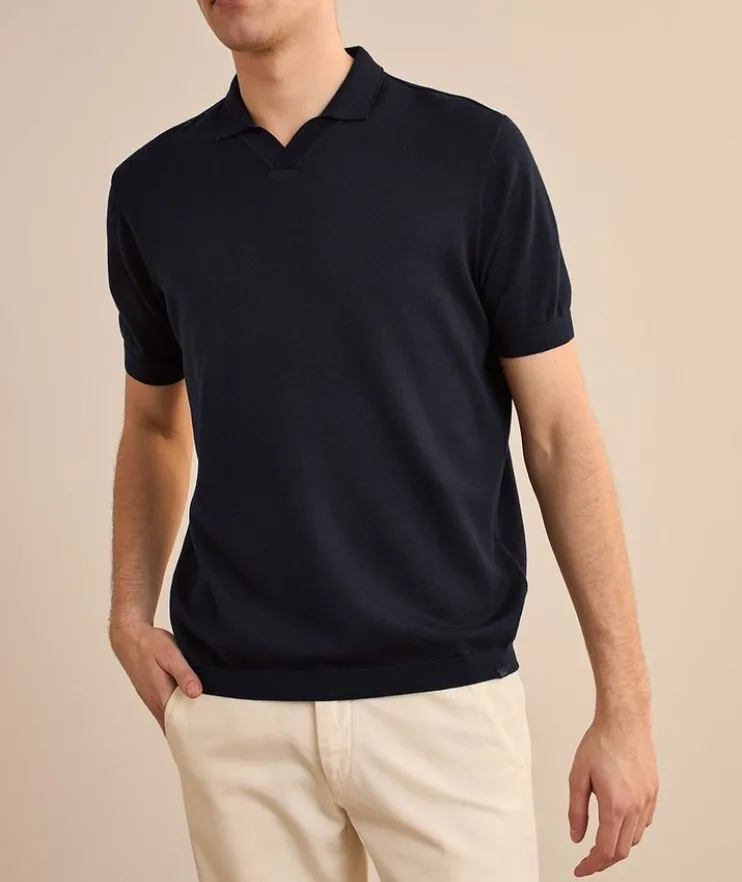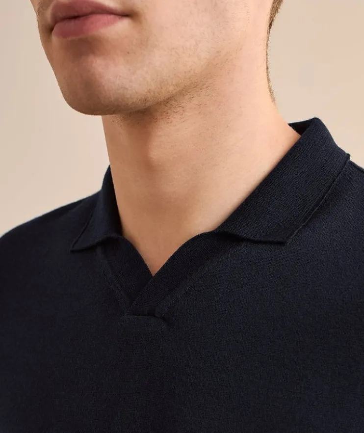 - Perfect for any occasion, this short-sleeve sweater is fashioned in luxurious virgin wool and styled with an open collar for a relaxed feel. Soft ribbed trim frames the garment’s simple, clean silhouette.