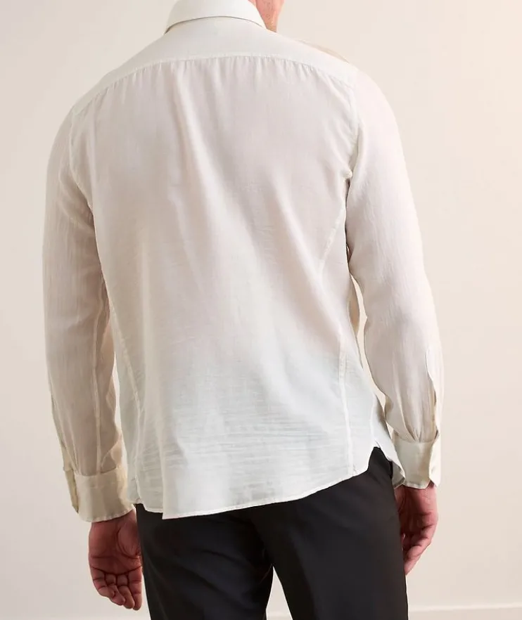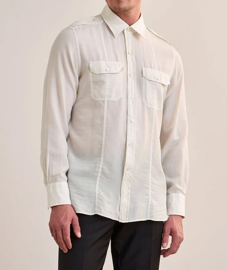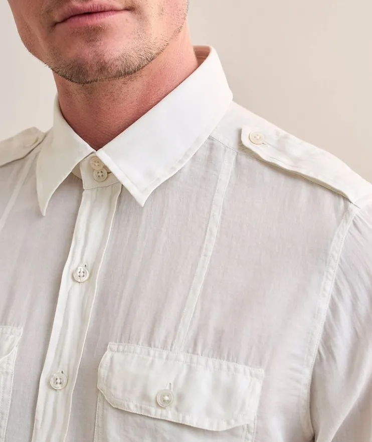- A versatile styling piece, this lightweight shirt is crafted from a soft cotton and silk blend with a twill texture. Shoulder epaulettes and pocket details lend a military-inspired aesthetic to finish it off.