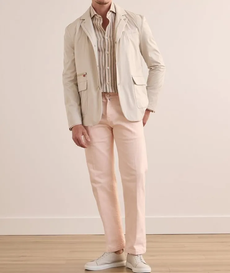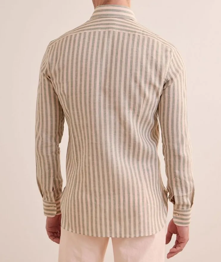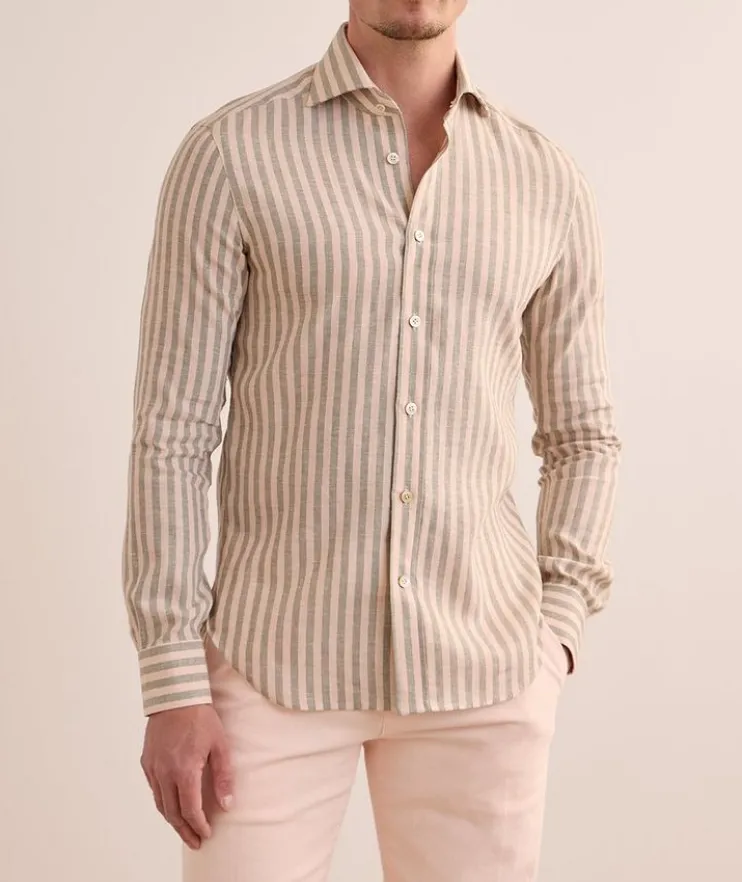 - A casual classic, this refined sport shirt is cut from a breezy linen blend with slight stretch and is finished in a wide stripe pattern.