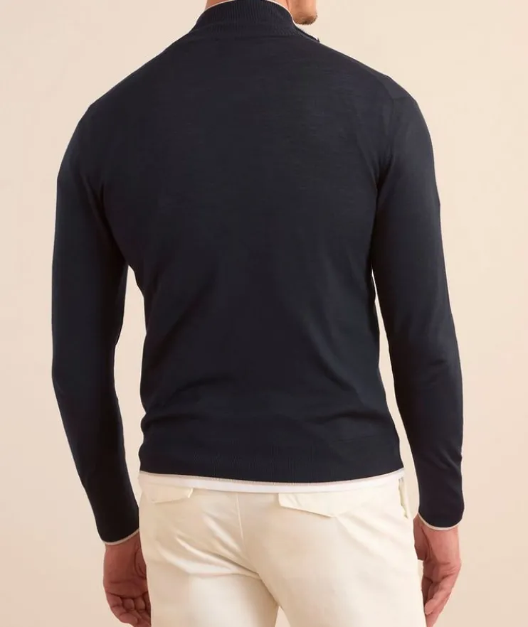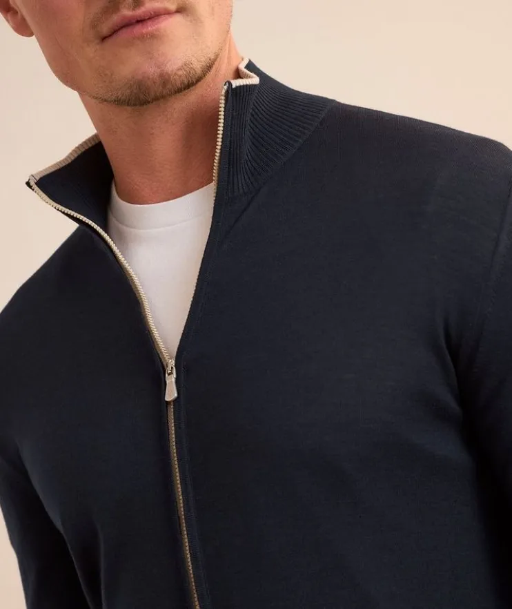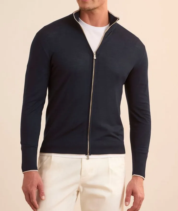 - Crafted from incredibly soft, lightweight wool with ribbed and contrast pipping details, this zippered cardigan makes for a refined layering piece year round.