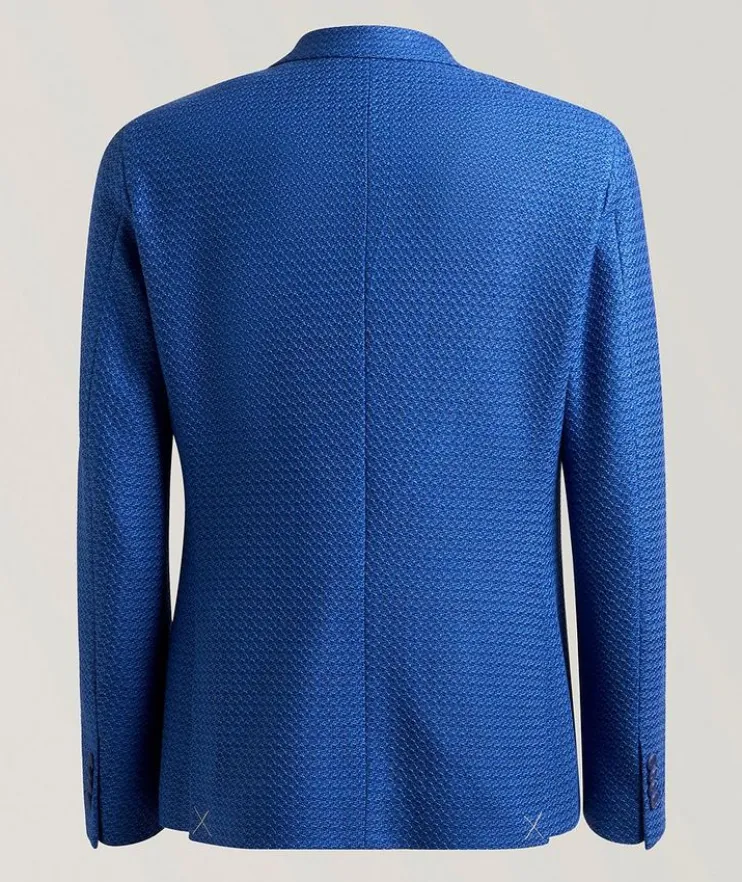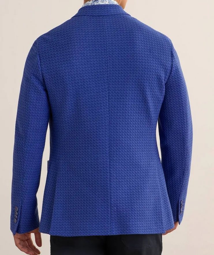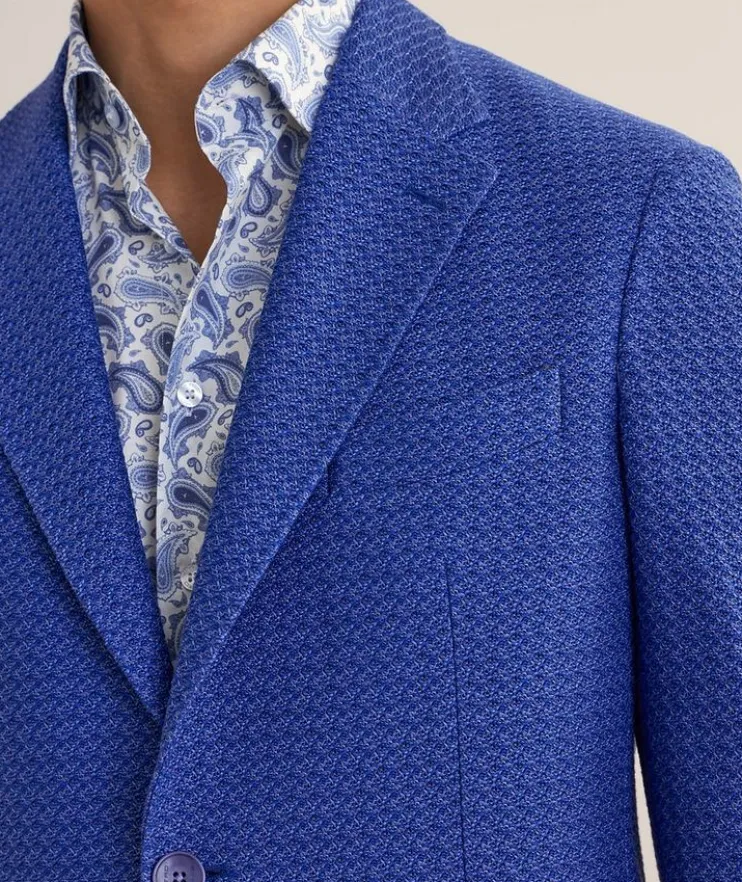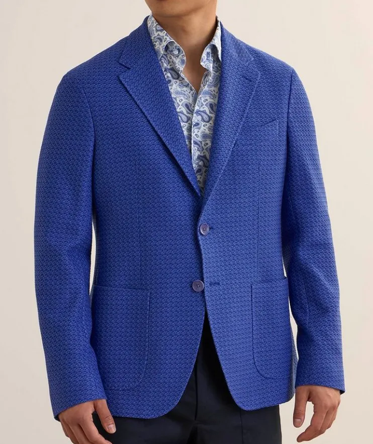 - This single-breasted sport jacket features a woven design for visual texture and easily elevates any ensemble. Crafted from a soft cotton jersey with a multi-coloured floral print lining.