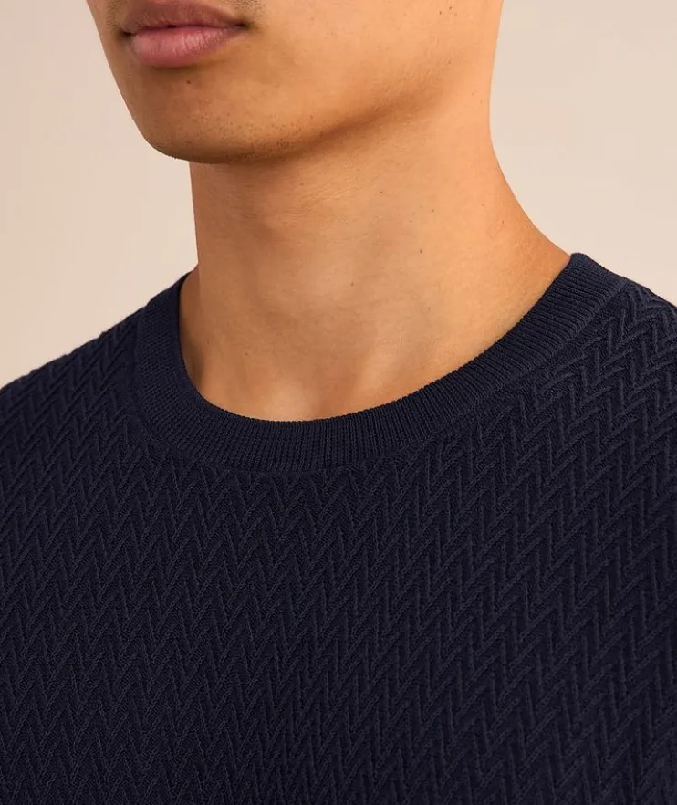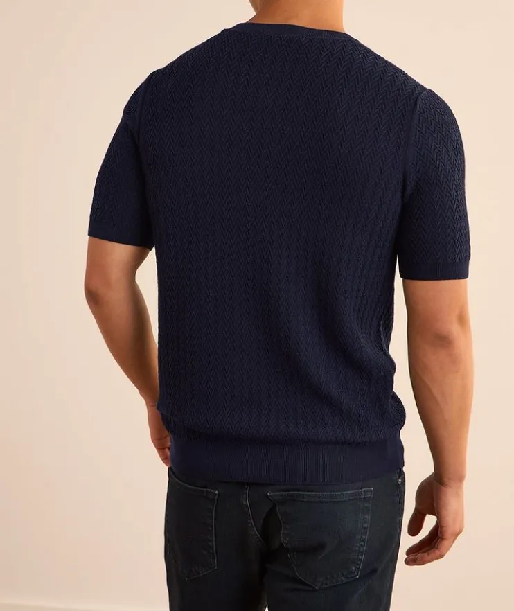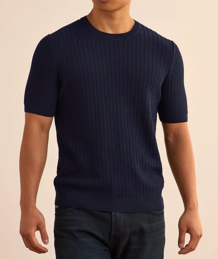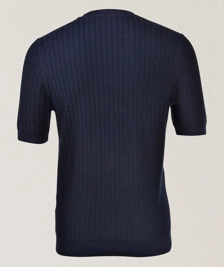 - A sophisticated knitwear piece for any season, this short-sleeved sweater is crafted from breathable cotton with a zig-zag knit design for visual texture.